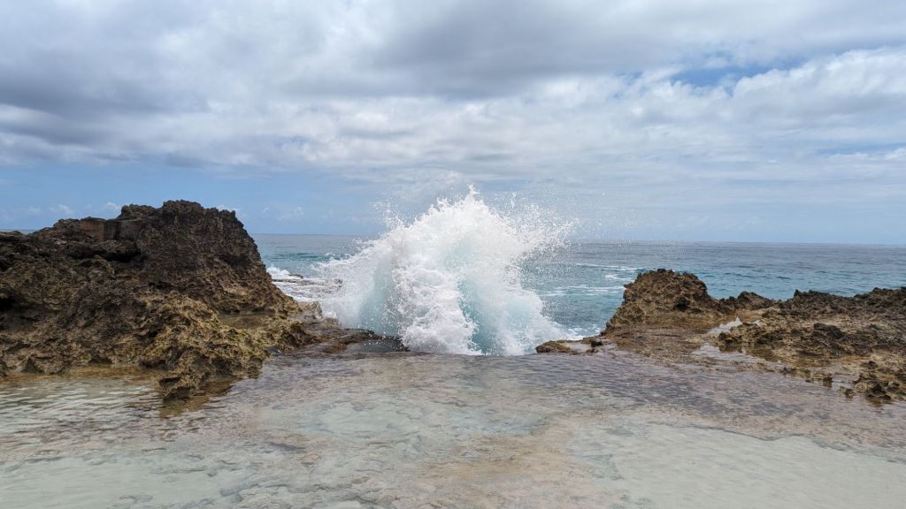 Sur le chemin, nous faisons une première escale à « La Douche ». La roche forme ici une petite piscine naturelle. En raison d’un goulot d’étranglement, les grosses vagues explosent en ce point et arrosent la zone. Au début ce n’était que des éclaboussures en arrière plan. Idéal pour une jolie photo. Mais finalement une grande vague ma bel et bien démontré le titre de ce lieu 😄.