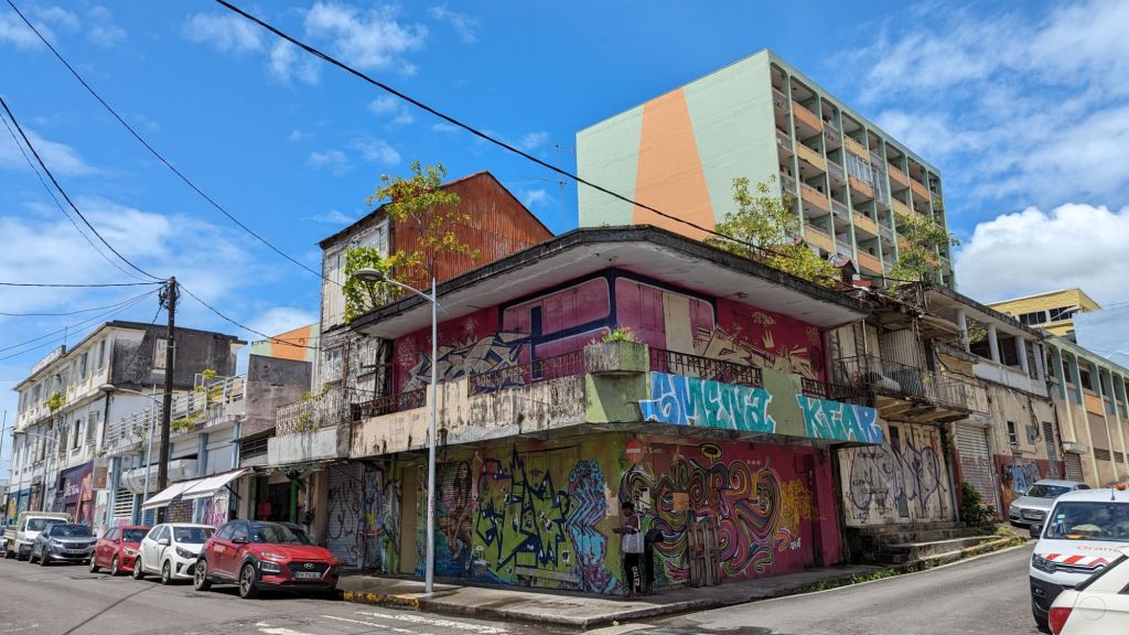 On nous annonçait une journée du tonnerre aujourd’hui. Non je ne parle pas d’ambiance mais de météo. Ce matin il n’y a donc pas d’urgence dans le réveil. Il est déjà clair que ce n’est pas aujourd’hui que nous ferons une excursion. Profitons-en pour prendre notre temps à la maison et faire une lessive. Il ne fait cependant pas si mauvais que cela. Mais nous essuyons régulièrement de grosses pluies au fur et à mesure du passage des nuages. Nous restons donc dans le coin et allons voir la capitale que nous n’avons pas encore visité, Point-à-Pitre. Bon ben soyons franc, c’est moche et dénoué d’intérêt. On croirait la ville en ruine. Tous les bâtiments font triste mine. Et il n’y a rien à voir. Si ce n’est, il est vrai, une grande quantité de street-art plutôt sympa. Même le marché semble destiné aux touristes exclusivement. Il faut dire qu’avec la présence d’un paquebot à quai, ils sont nombreux.