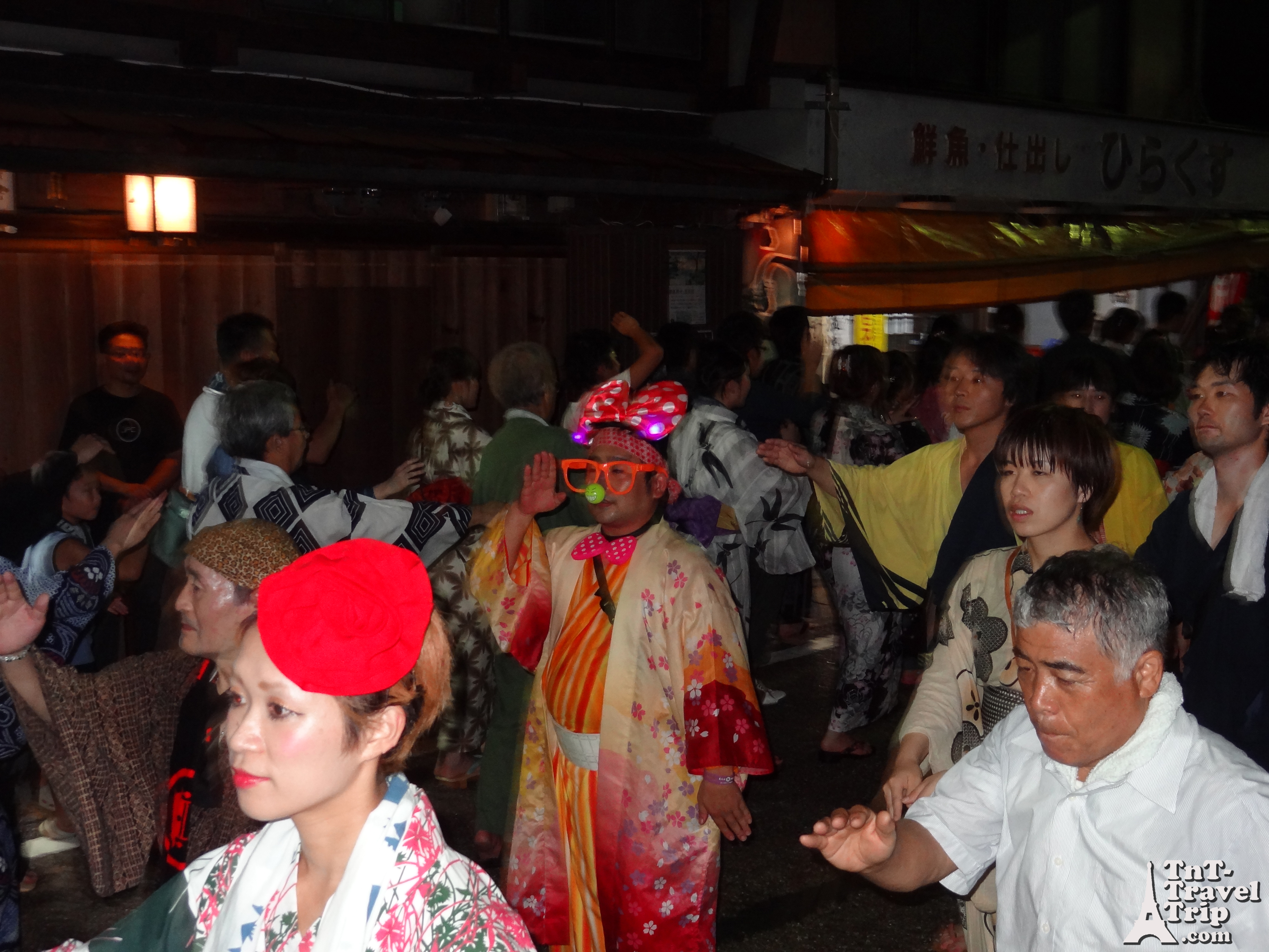 Après toutes ces péripéties nous parvenons donc à nous rendre à Gujō au centre de la préfecture de Gifu. Ici a lieu tous les ans, du 13 au 16 Août, le festival de danse Odori. Et ça tombe bien car nous sommes le 14. Ici, on danse toute la nuit les pas simples de l’Odori.