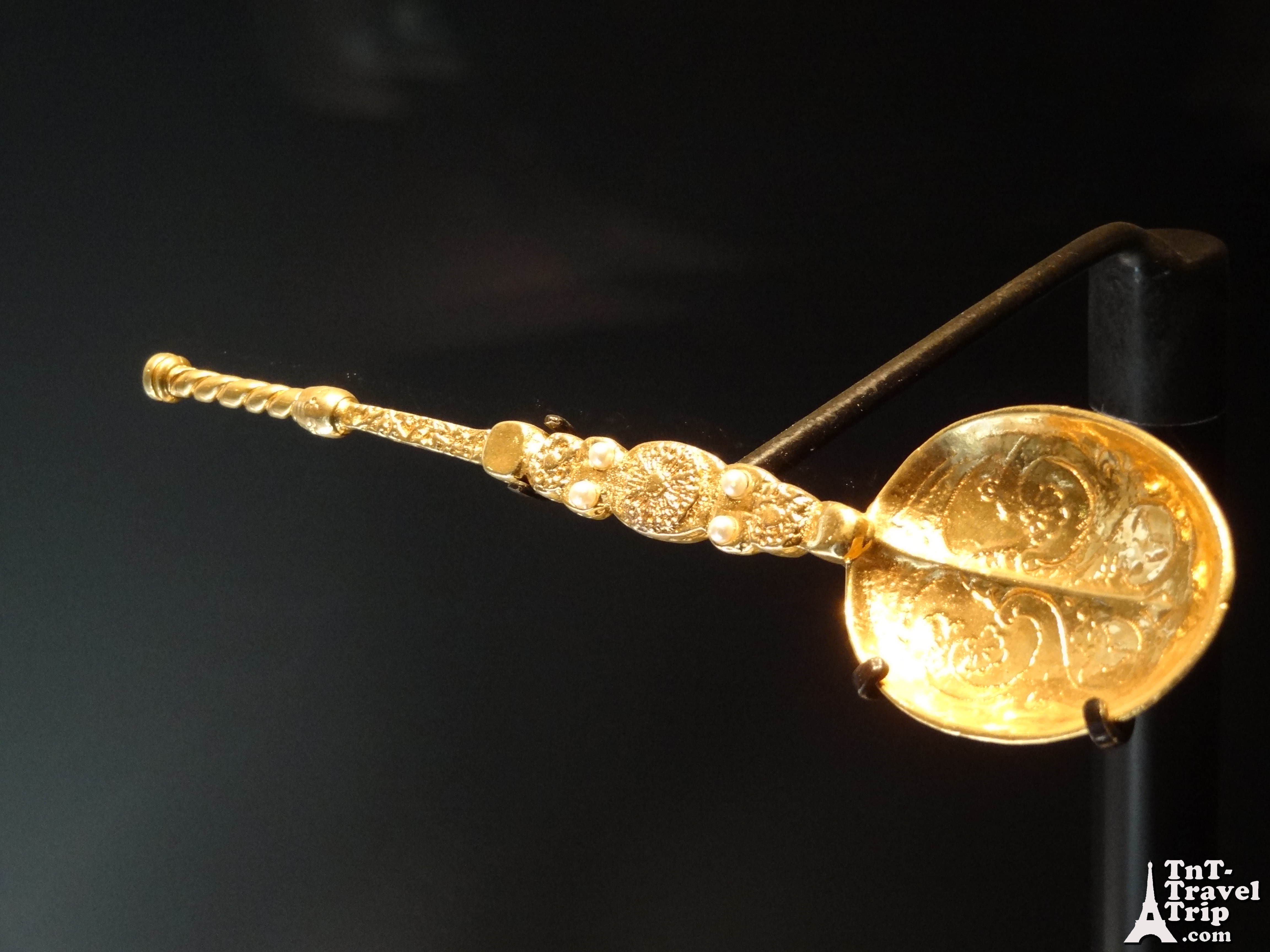 Une reproduction de la cuillère en or utilisée lors d’un couronnement ici exposée dans un autre bâtiment.