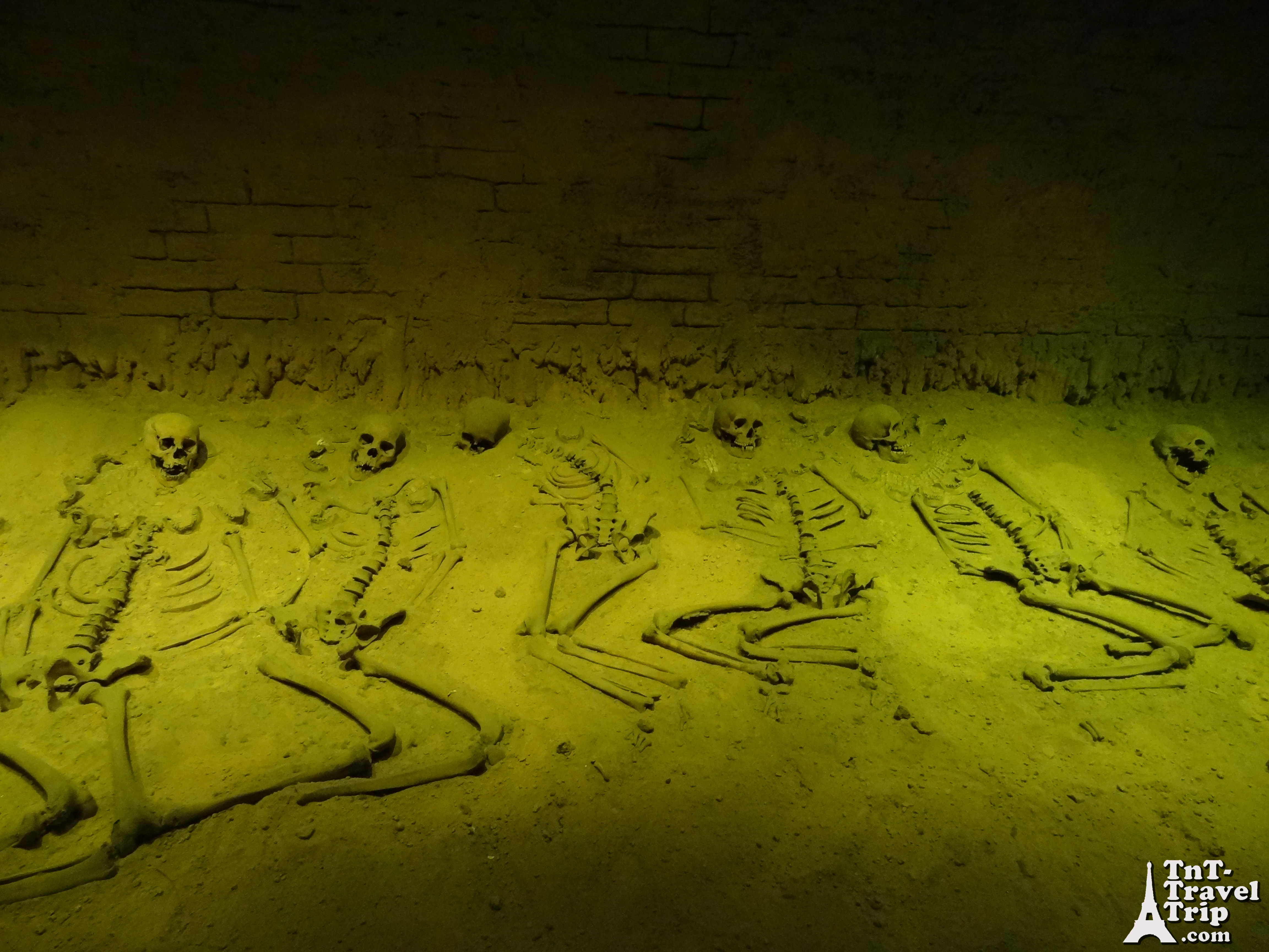 A l’intérieur on été rassemblés les squelettes découverts sur le site de fouille. Ils ont été disposés à l’identique.
