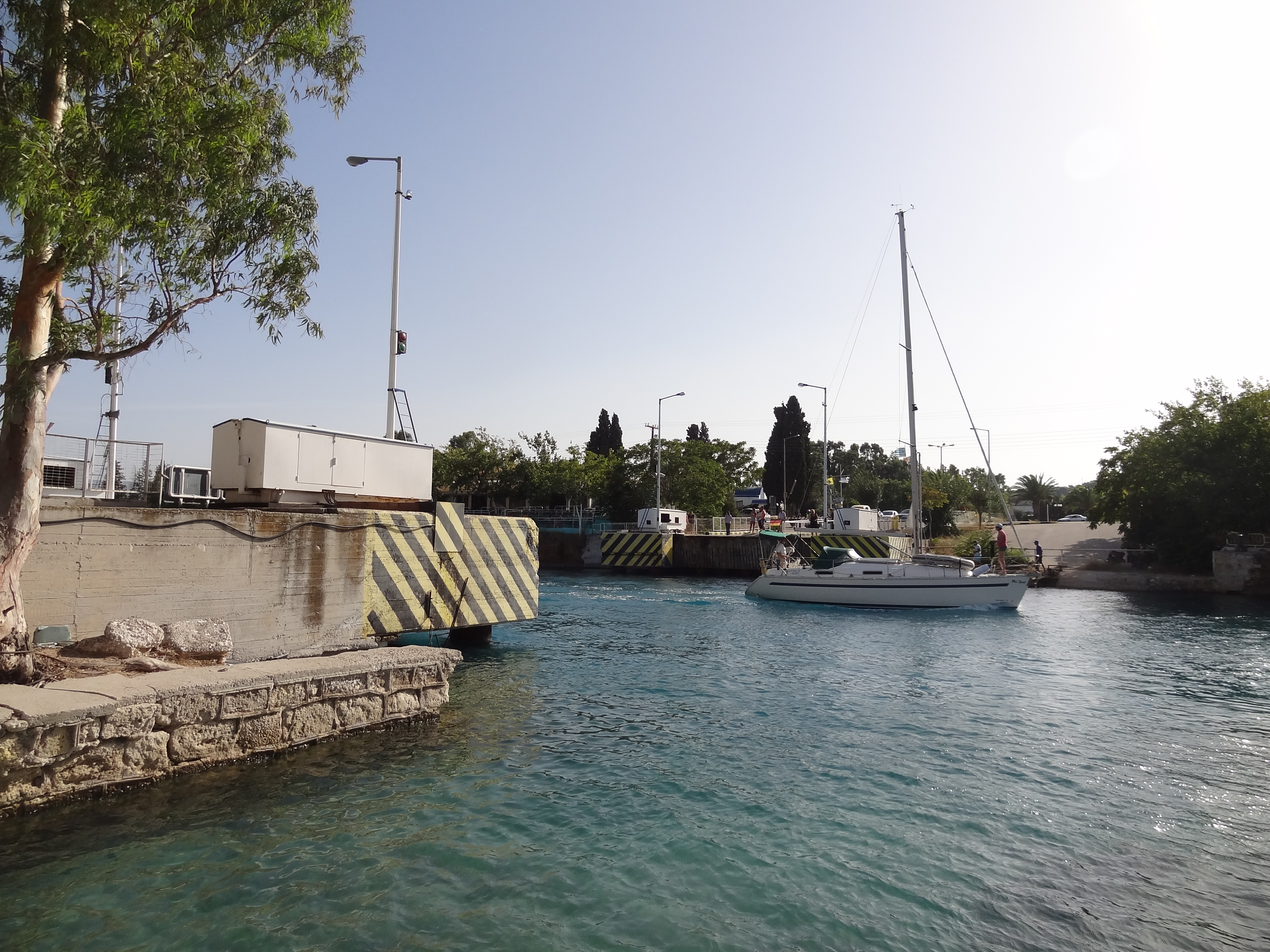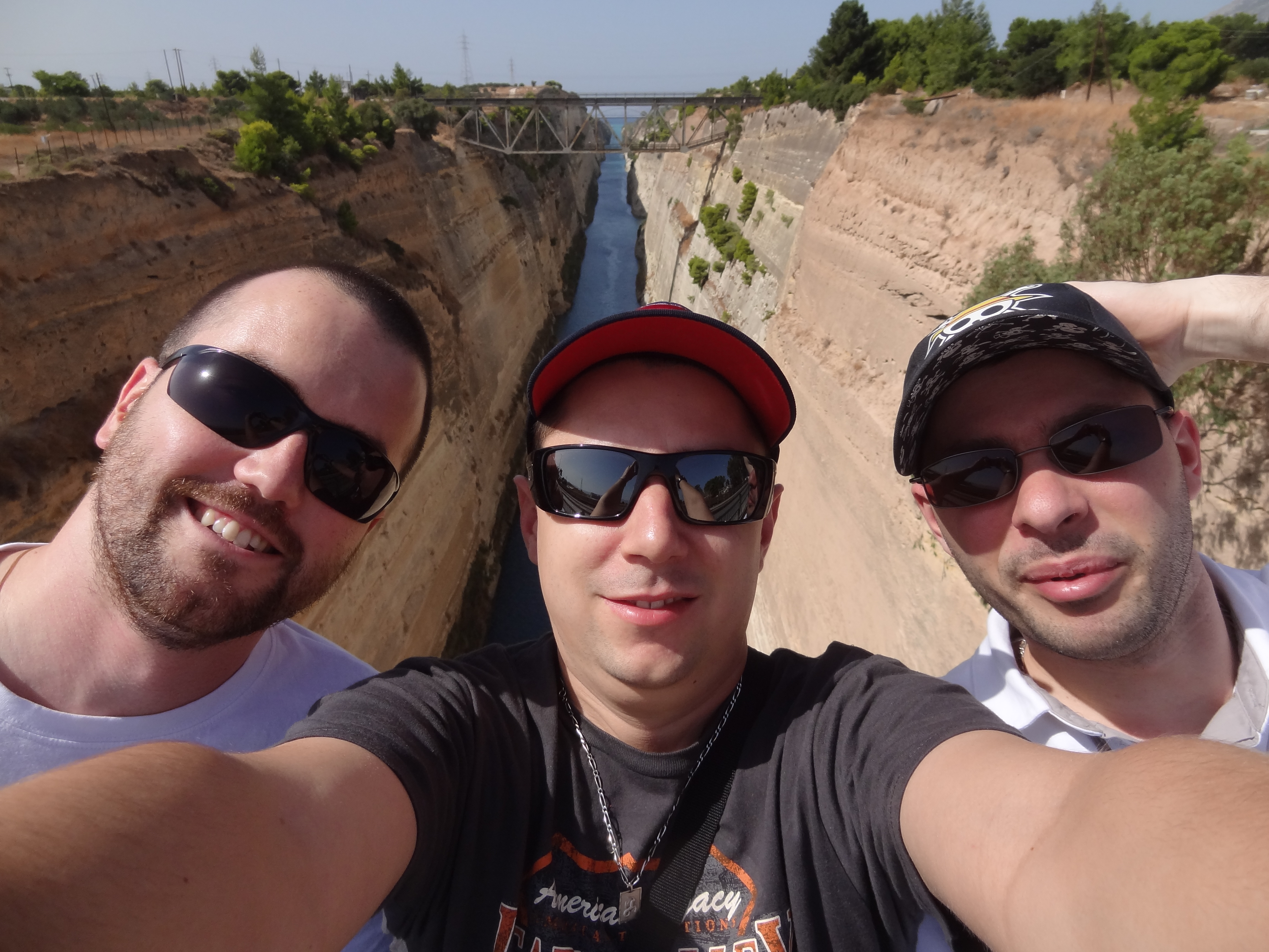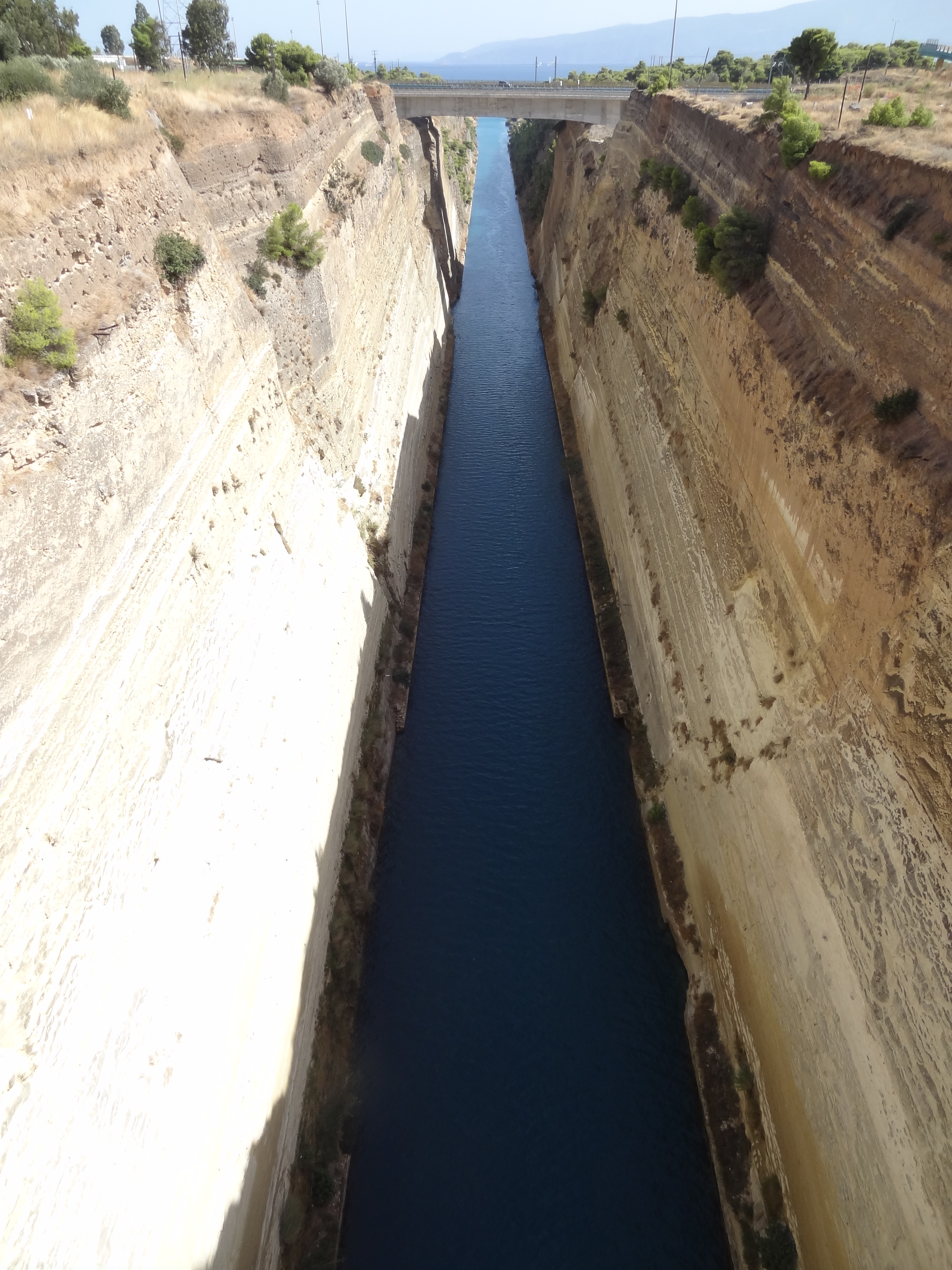 Nous arrivons sur Corinthe, ou presque, on ne sait pas trop. Ce qui est sûr c’est qu’il n’y a pas d’hôtel là où le GPS nous mène. Nous continuons donc le long de la mer sans grand succès, mais nous apercevons en face des hôtels qui pourraient correspondre à la photo. Nous faisons donc demi tour. On traverse le canal et arrivons dans une partie plus vivante de la ville. Nous continuons jusqu’à se retrouver bien trop haut pour encore croiser des hôtels, nous n’avons pourtant pas vu le notre. Bon, on abandonne pour l’instant et décidons d’aller voir le canal de plus près.
