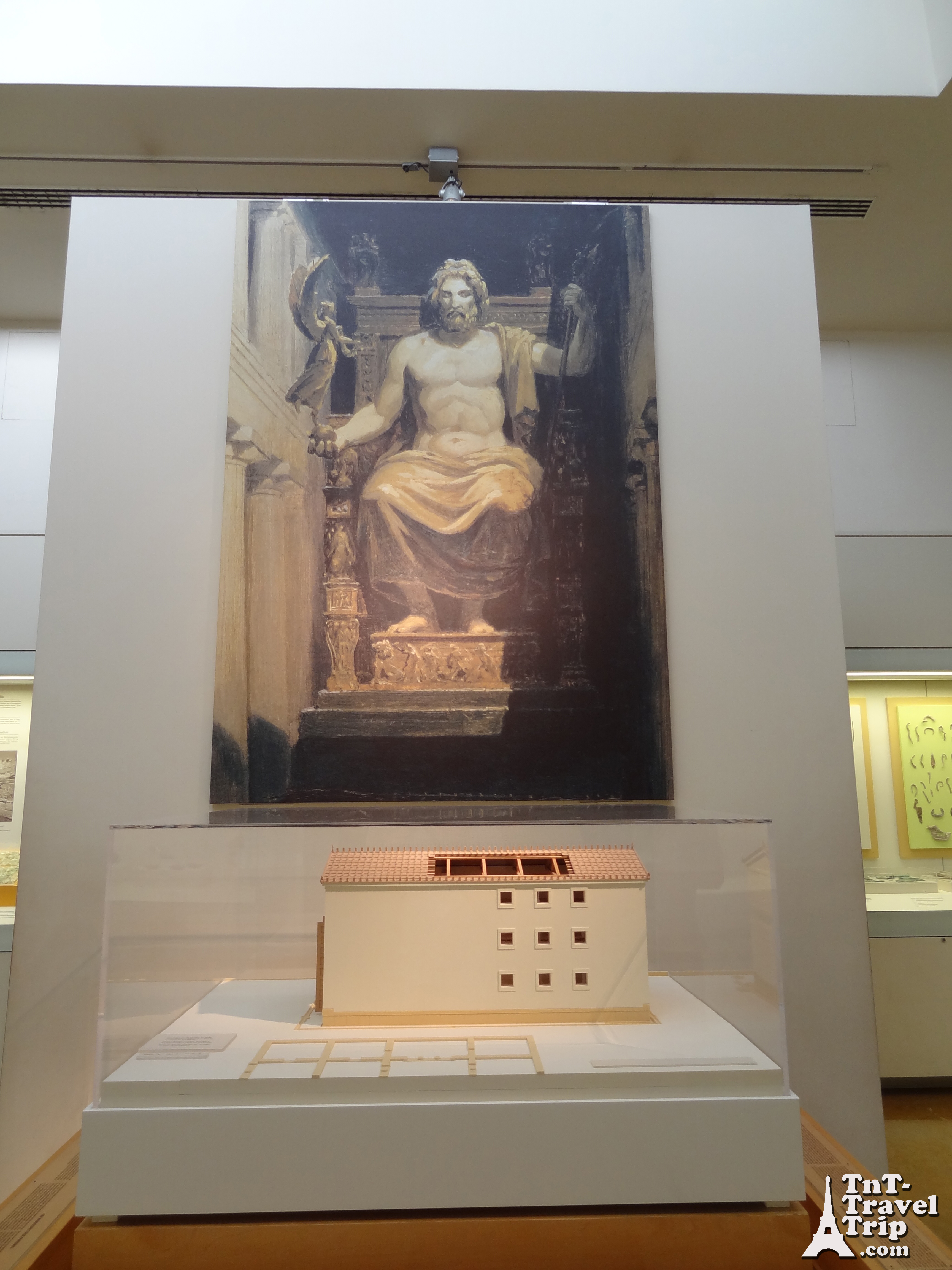 C’est le sculpteur Phidias qui réalisera, dans son atelier construit tout proche du temple, la statue chryséléphantine de Zeus peut avant 436 av. J.-C.. Assis sur son trône, couronné d’un rameau d’olivier, la statue d’ivoire portait en sa main droite une représentation en or de Niké, déesse de la victoire, et empoignait de sa main gauche un sceptre en or surmonté d’un aigle.