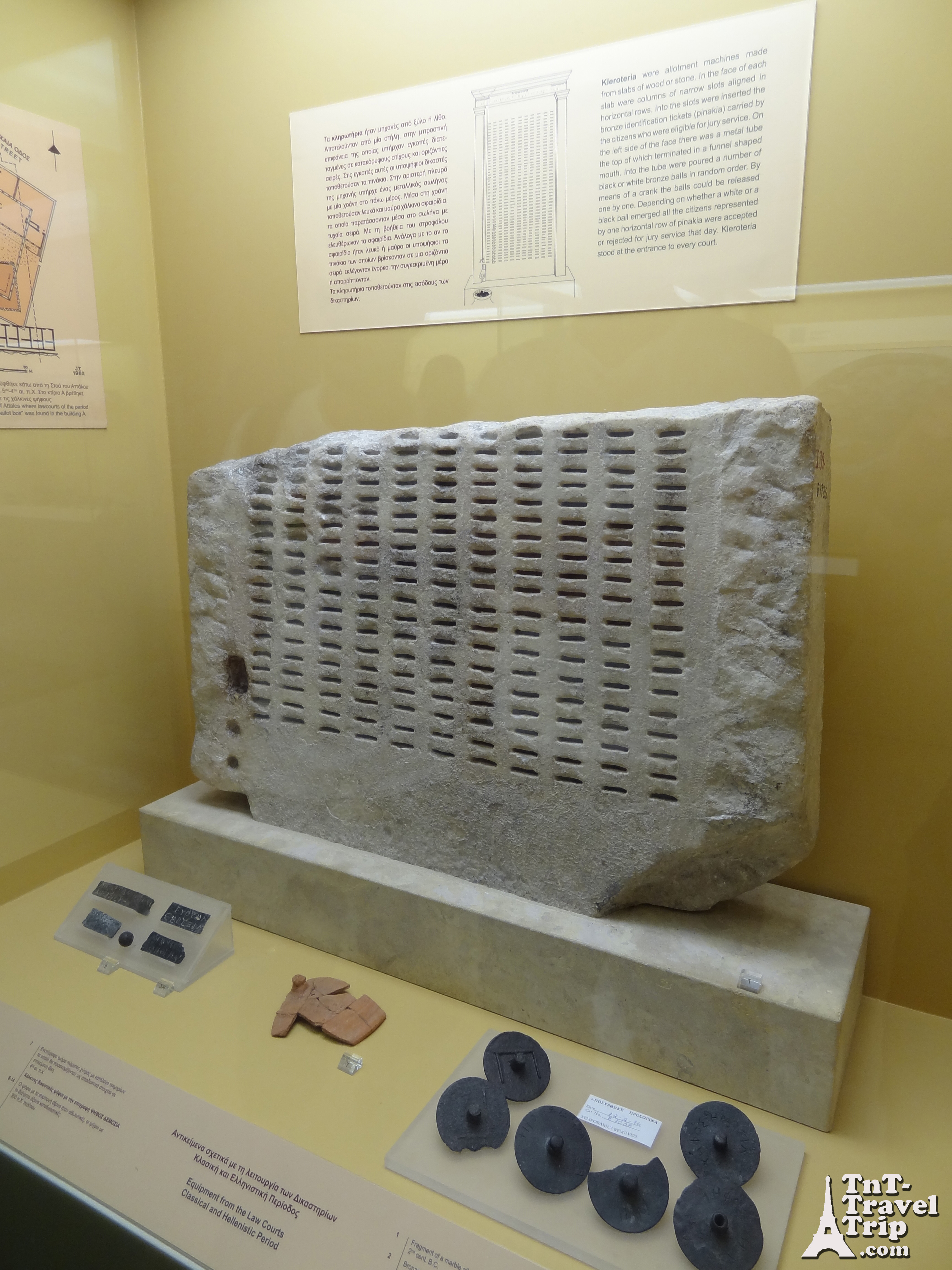 Cette machine permettait de tirer au sort les membres d’un jury. Les noms des citoyens étaient inscrits sur des petites plaques de bronze (le Pinakion) puis introduit dans cette pierre. Une colonne à gauche contenait une série de boule blanche ou noire tombées aléatoirement. Suivant la couleur de la graine, la ligne était sélectionnée ou non.