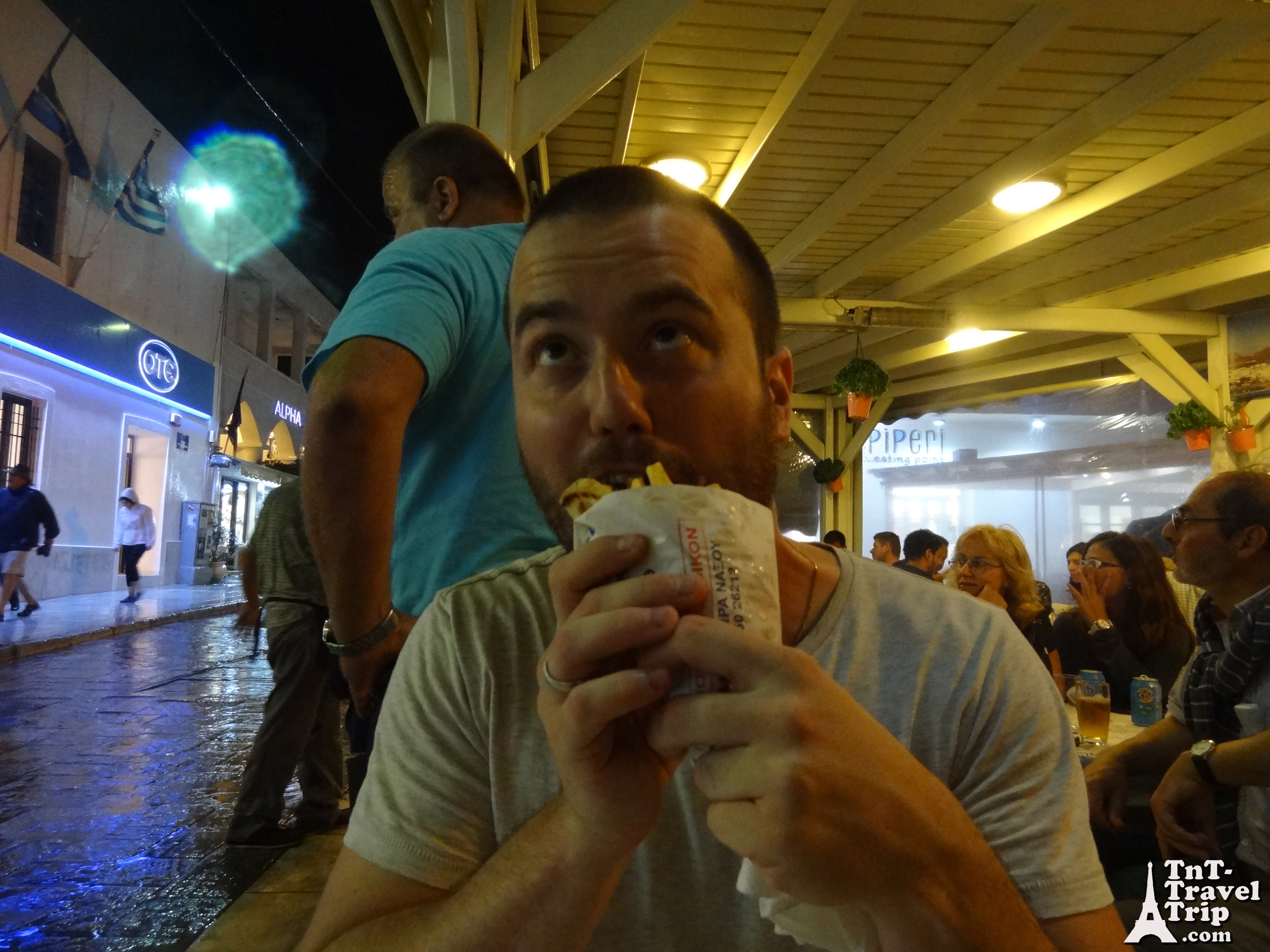 Il commençait à pleuvoir depuis que nous sommes sortie de l’hôtel, mais là, à peine nous étions assis sous la tonnelle, les choses sérieuses ont commencé. Nous ça ne nous a pas dérangé. Un peu de fraîcheur ne faisait pas de mal et nous étions bien à l’abris pour manger nos délicieuses Gyros Pita au poulet.