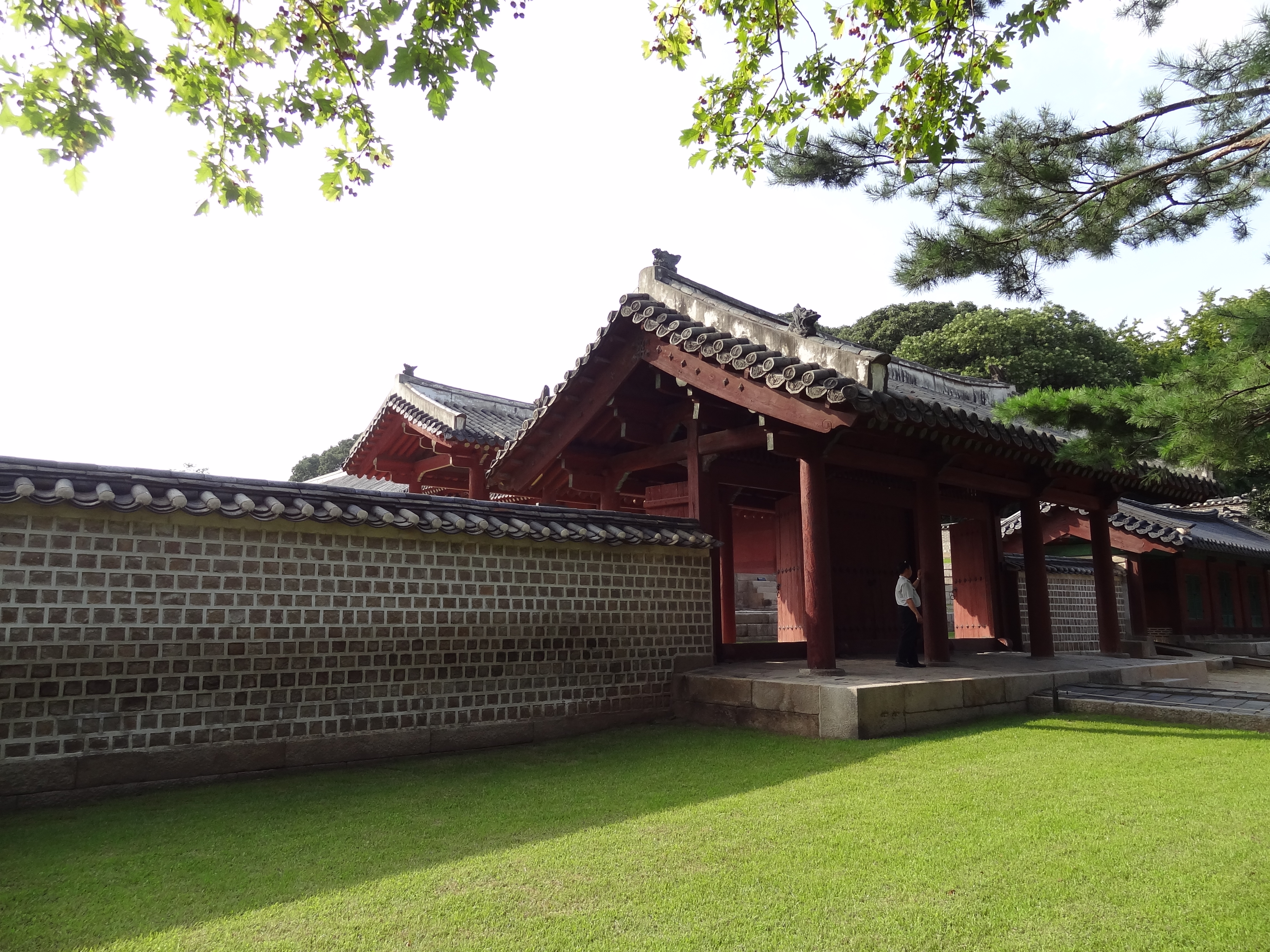 Nous avons un peu galérés pour le visiter. Si cette fois nous avions bien vérifiés qu’il était ouvert le lundi avant de prendre le métro, nous sommes arrives trop tard pour la visite en anglais. En effet, ce sanctuaire ne peut se visiter que en visite guidée. Sauf le samedi ou il semble libre d’accès. Et la dernière visite en anglais était à 16h. Mais, voyant qu’une visite en Japonais allait commencer, nous voulions nous y inscrire. Mais pas facile de se faire comprendre. La dame nous dit que la prochaine visite  est a 17h. Il s’agit de la visite en coréen, mais bon on ne cherche plus, on accepte d’attendre. Elle appelle alors quelqu’un sur le site puis nous dit que nous pouvons finalement y aller tout de suite.