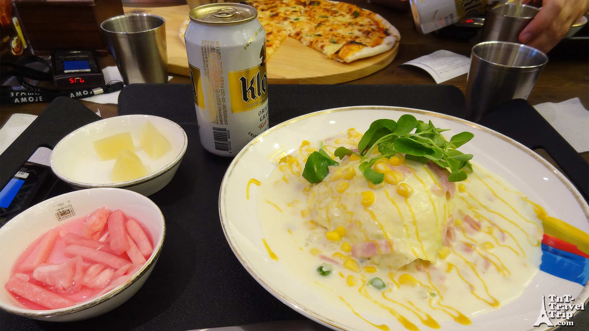 Moi j’ai choisi de prendre une Omuraisu. Oui ça sonne Japonais … ben c’est parce que c’est un plat d’origine japonaise. Enfin non, ça devrait sonner Ome-rice parce que c’est surtout occidental. Enfin bref, c’est une omelette comme chez nous (« Ome ») avec laquelle les Japonais ont rajouté du riz (« Rice ») et que les Coréens ont piqués.