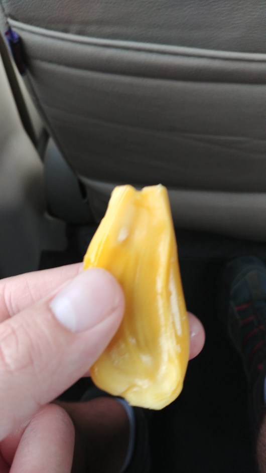 Et enfin, le fruit du Jacquier. Ça c’est très fréquent. Je l’ai déjà photographié plusieurs fois sur ce blog même. C’est énorme fruit à la peau dur et épineuse. J’avoue l’avoir souvent confondu avec le Durian. Mais ce dernier est beaucoup plus petit. Comme une petite pastèque. Mais jamais je n’avais eu l’occasion de le goûter. C’est aussi super bon bien entendu ; ).