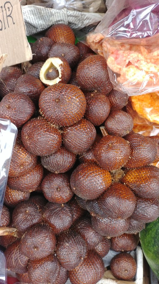 Ce samedi, notre seul but est de se rendre à Pemuteran au nord-ouest de Bali. Pour ça on a loué les services d’un guide chauffeur. C’est pas très loin techniquement. 125 kilomètres. Mais on traverse les montagnes. Et ici les routes … Du coup ça va nous prendre la journée. Mais le guide nous arrête sur les coins touristiques. Avec le classique marché au fruit tout d’abord. C’est l’occasion de gouter de nouveaux fruits. Mais déjà à l’hôtel avec le fruit du serpent.