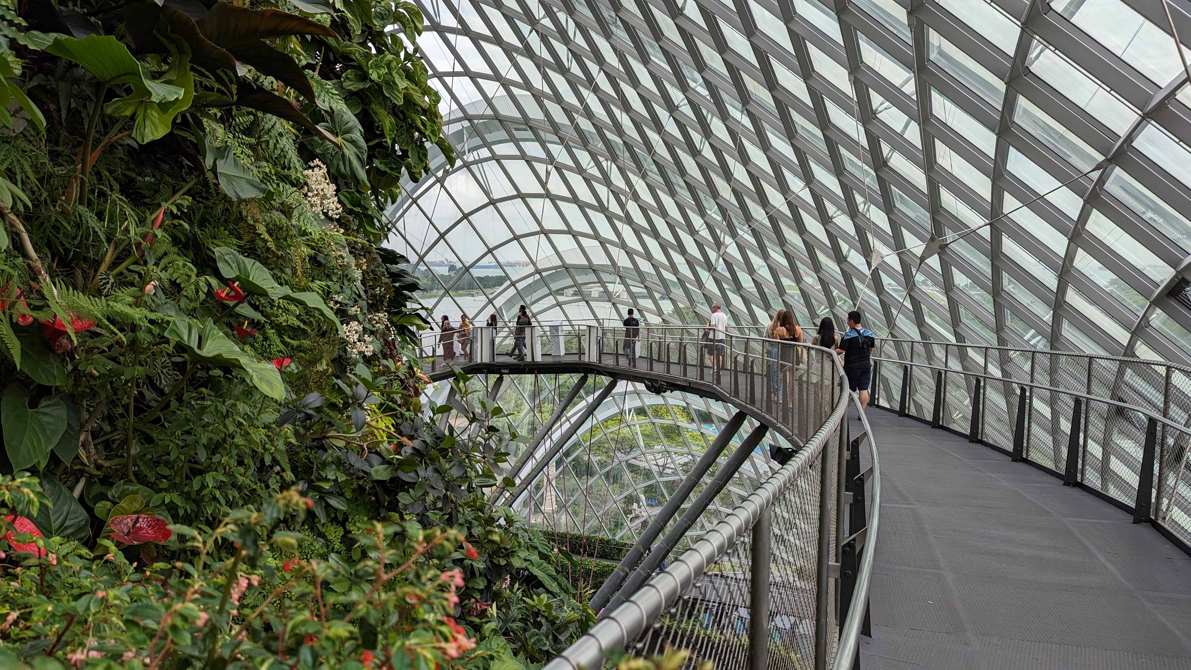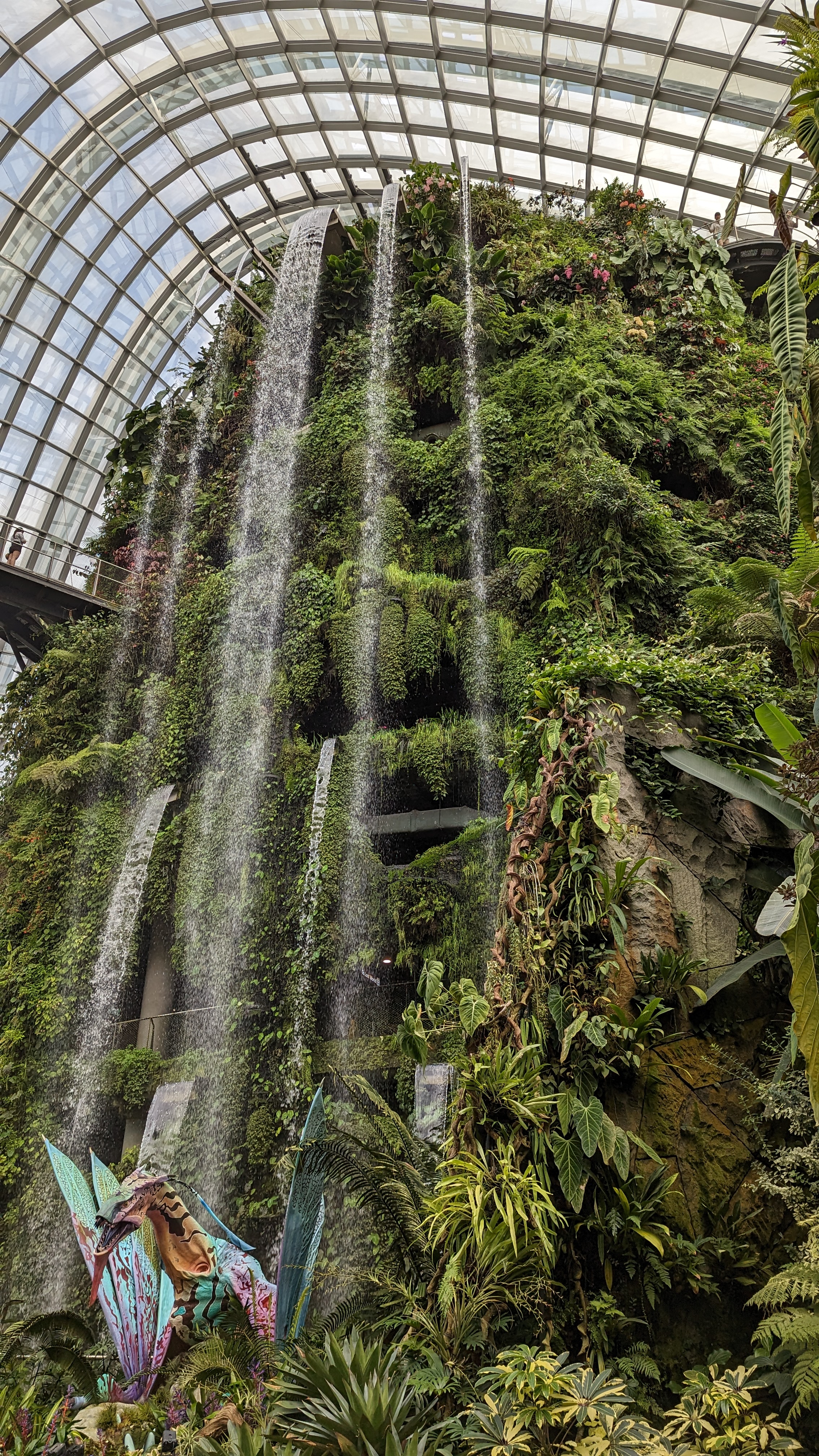 Le jardin comporte deux serres géantes, le Flower Dome et le Cloud Forest. La première est actuellement fermée. La seconde héberge une exposition Avatar. Nous allons donc prendre un ticket pour visiter la forêt tropicale Avatar et monter dans dans les arbres « Supertree ». Pour cela nous déboursons tout de même la coquette somme de 41 € !!! Mais bon, ce n’est pas tous les jours que nous sommes à Singapour. La montée dans l’arbre m’a plutôt déçu. Car c’était juste monter et descendre dans une tour pas bien haute finalement. Et par exemple, la passerelle que l’on voit sur la photo plus haut, c’est payant en supplément. Par contre, la serre c’était sympa. Un peu petit finalement, au vu du prix en tout cas. Mais vraiment cool.