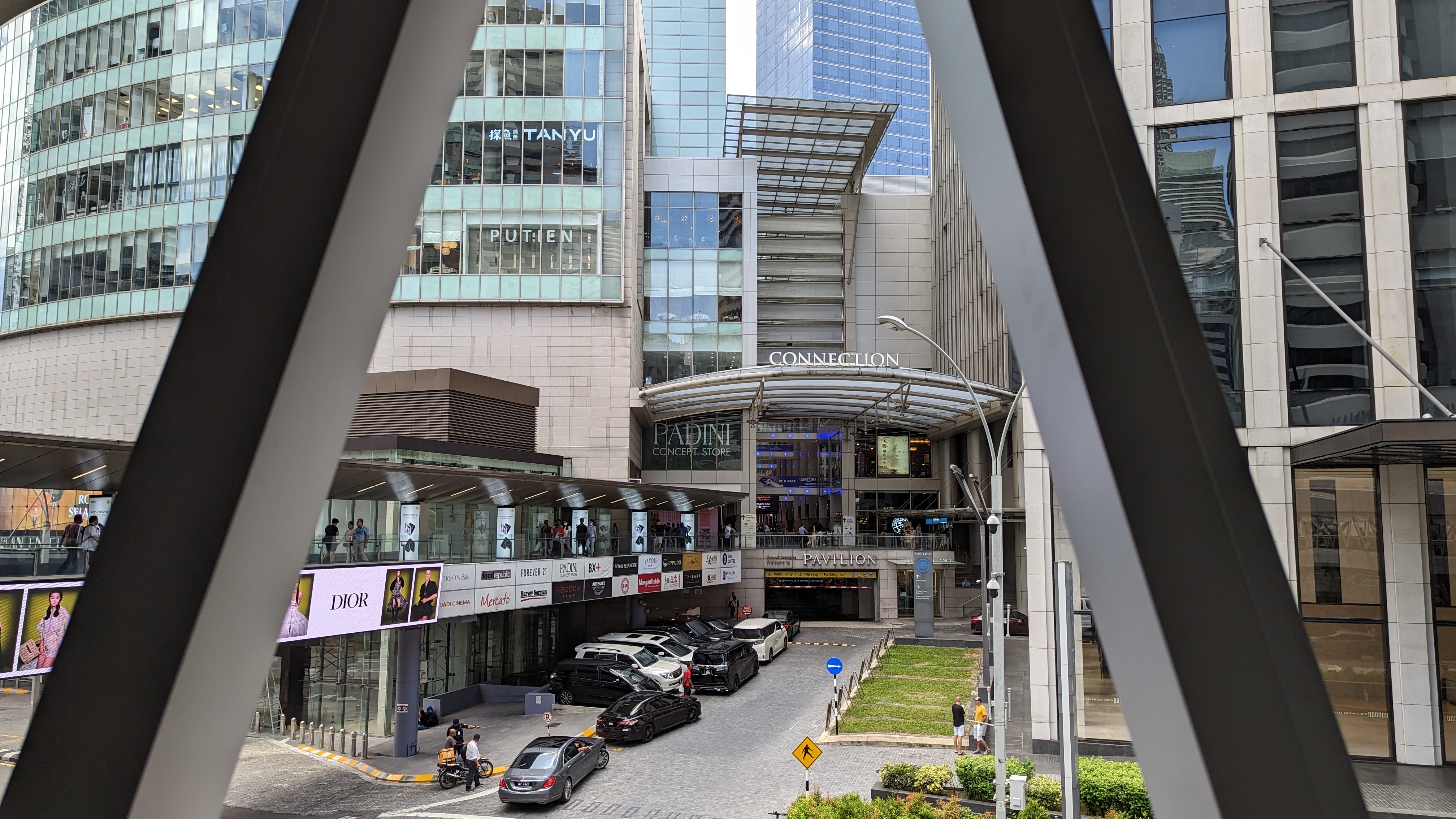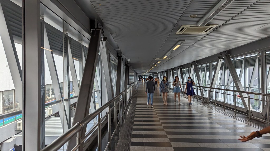 La première rue qui remonte au Nord est celle où nous avons mangé hier. Elle mène directement aux pieds des tours et donc à l’ouest du parc. Je décide de prendre la rue suivante pour changer. Cependant les rues sont plutôt rares finalement. Nous sommes sur un grand axe bordé de grands bâtiments. Et ça commence à nous éloigner de notre destination. Nous trouvons finalement un panneau piéton qui indique le parc et nous oriente vers une passerelle piétonne. Comme la météo en Asie peut souvent se résumer par trop chaud et très grosses averses. Et comme jusqu’à maintenant dans la ville les trottoirs ne sont vraiment pas top. La solution a simplement été de construire une longue passerelle couverte et climatisée.