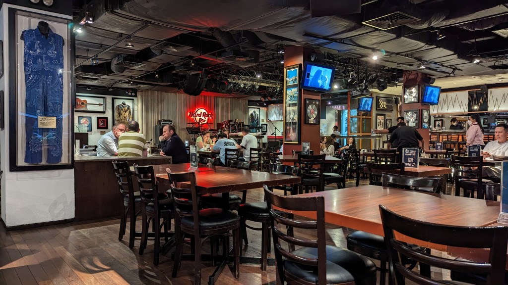 Je vous l’ai dit, la météo en Asie c’est la chaleur mais aussi les grosses averses. Et c’est ce qui va nous arriver à la fin de notre visite du temple. Durant le trajet en Grab jusqu’à l’hôtel, ça devient de pire en pire. Ça va passer mais pour l’instant ça dure :). Donc nous décidons de ne pas aller bien loin ce soir. Notre hôtel se trouve juste au-dessus du Hard Rock café. Voilà un excellent moyen de passer la soirée au sec.