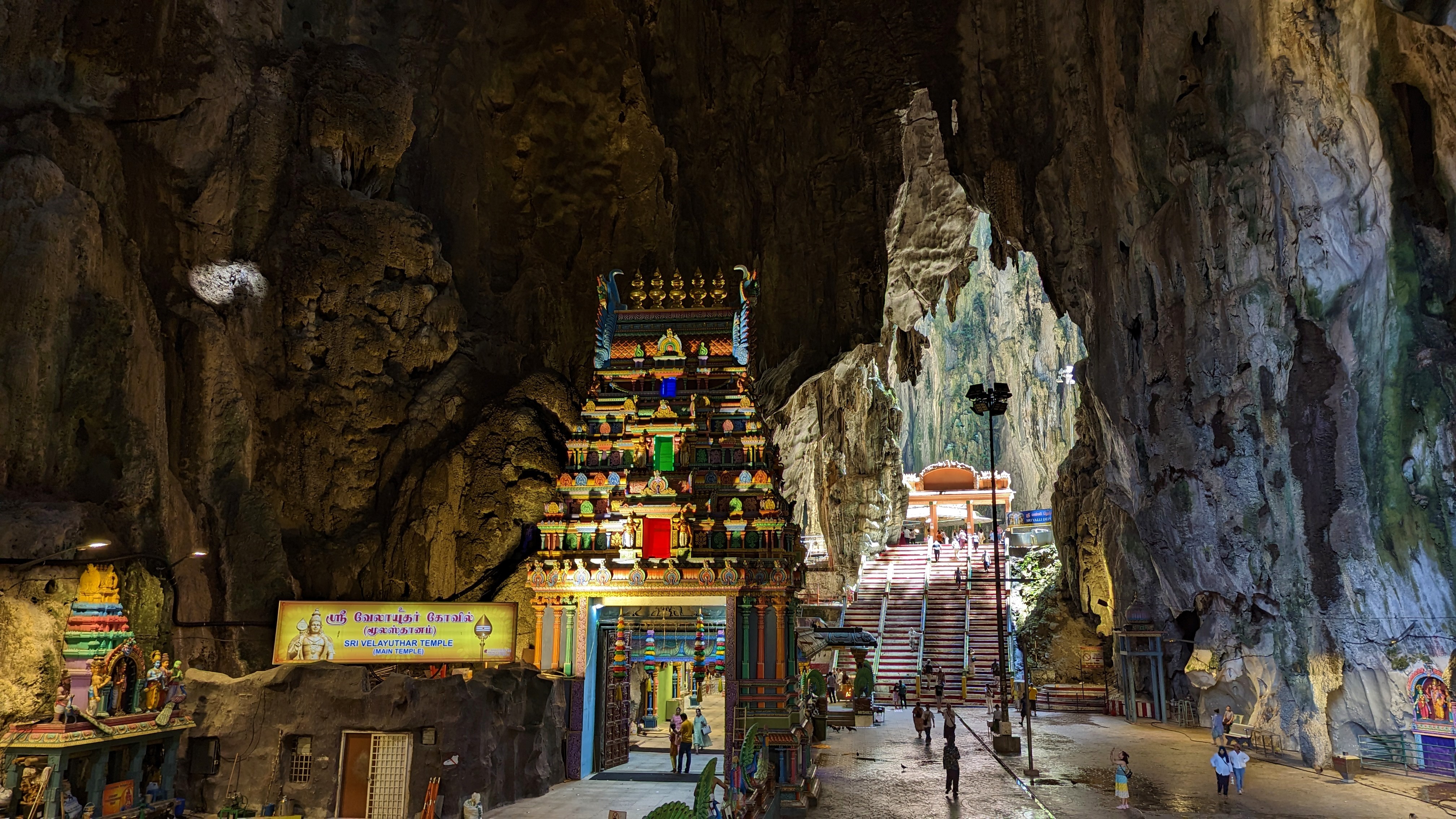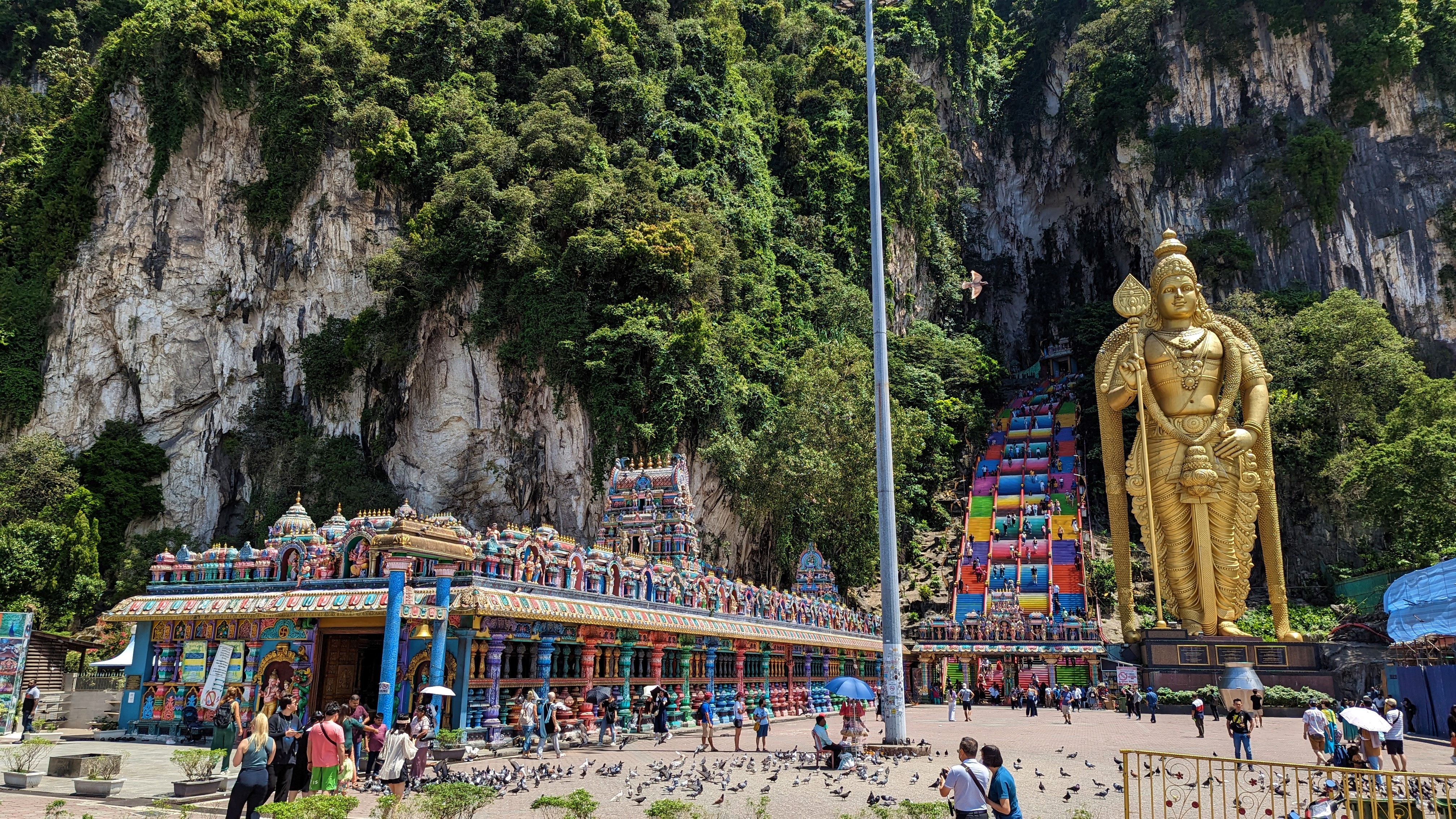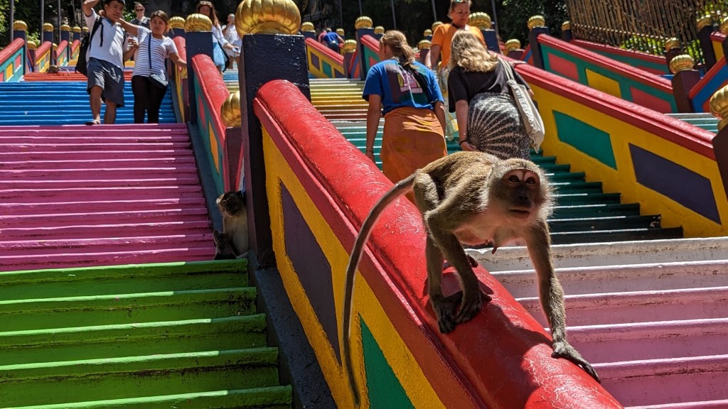Cette fois, nous savons ce que nous allons faire aujourd’hui. C’était prévu de longue date. Les grottes de Batu et son grand temple sont un incontournable de la Malaisie. Il s’agit cette fois d’un sanctuaire hindou dédié à Murugan et donc construit dans une immense grotte. Il est également connu pour ses 272 marches pour y accéder. Elles viennent d’ailleurs d’être peintes en 2018 en couleur. Au bas des marches se trouve déjà le principal lieu de prière. A la seule condition de se déchausser, on peut visiter cette partie qui vaut déjà le coup d’œil. Les temples hindou sont très colorés. Sur le côté opposé de ce premier temple, par rapport aux escaliers, se dresse une statue de Murugan de 43m. Après cette première partie, nous entamons la montée des marches. Il fait très chaud aujourd’hui, enfin comme tous les jours en fait, sauf sous une averse. Mais là c’est vrai qu’on le sent bien en plein soleil :). Nous ne sommes pas tout seul sur les marches. Il y a une flopée de touristes bien sûr. Mais il y a aussi quelques singes venu voir si nous avions pas deux trois offrandes 🐒. Une fois en haut, nous rentrons dans une immense grottes. Le sol est complètement aménagé et il reste d’ailleurs encore quelques marches à l’intérieur et c’est presque le même paterne qui se répète. Un autre temple est construit à l’intérieur et à sa droite un escalier, avec moins de marche heureusement, pour cette fois accéder à une autre grotte complètement ouverte, comme un grand puits. Et c’est tout simplement magnifique.