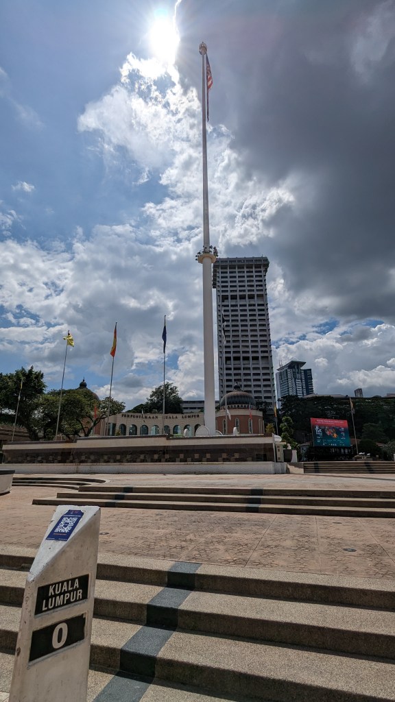 La visite de Batu Cave ne nous a clairement pas pris la journée. Nous avons encore du temps. Alors c’est parti pour la découverte de la ville. Hier, en rentrant du temple, j’ai vu depuis le Grab, sous la pluie, une grande place surplombée d’un immense drapeau Malaisien. C’est un peu à l’image de la place de la constitution à Mexico mais en plus petit. Toujours armé de mon téléphone, je cherche et trouve qu’il s’agit de la place de l’indépendance. Le temps de sauter dans un Grab et nous nous rendons à ce que l’on pourrait appeler le centre historique de la ville. Et finalement, on ne peut pas mieux le décrire vu la présence de la borne kilométrique 0 sur la place.