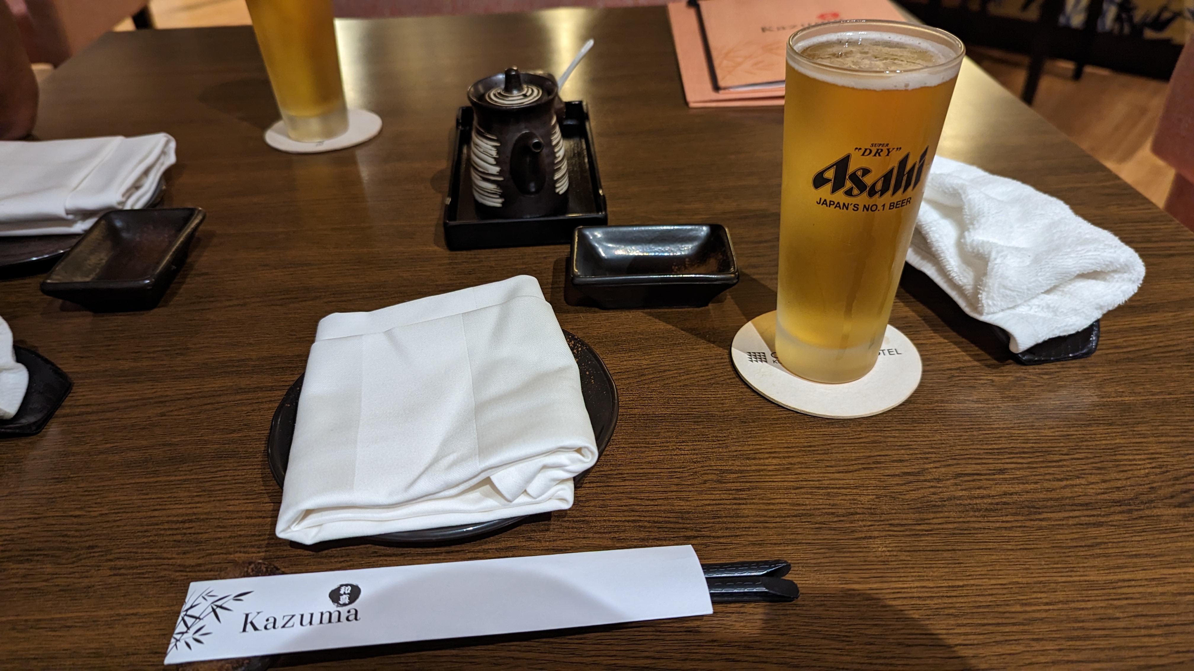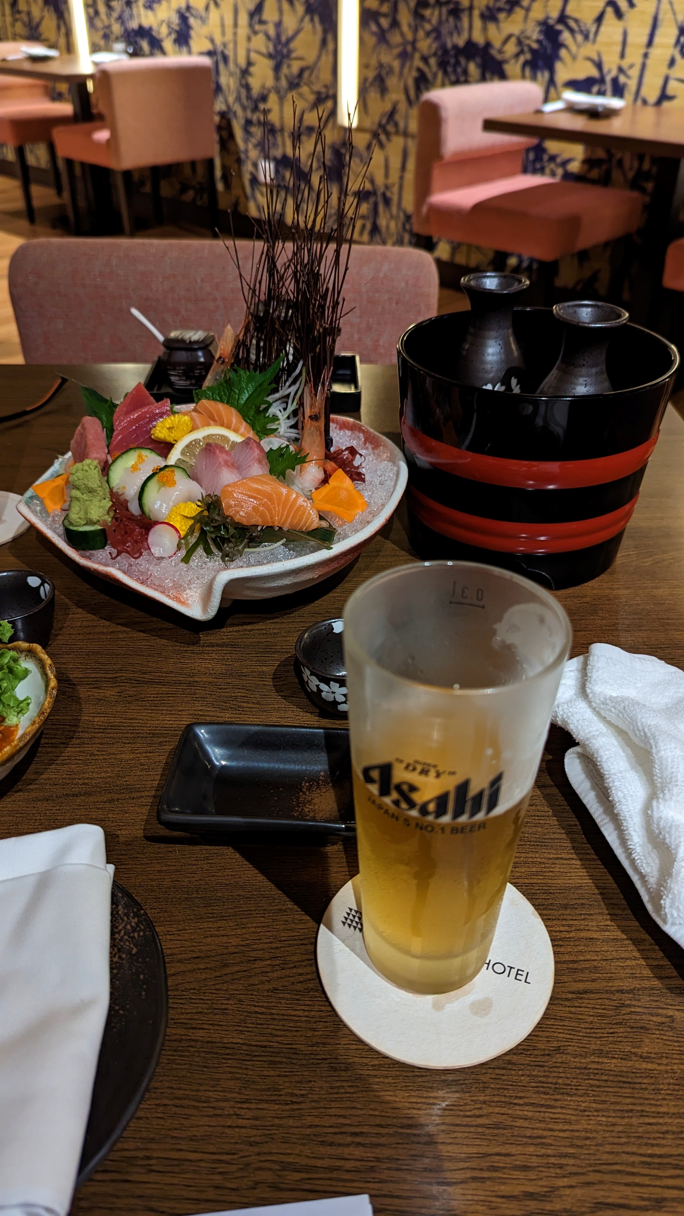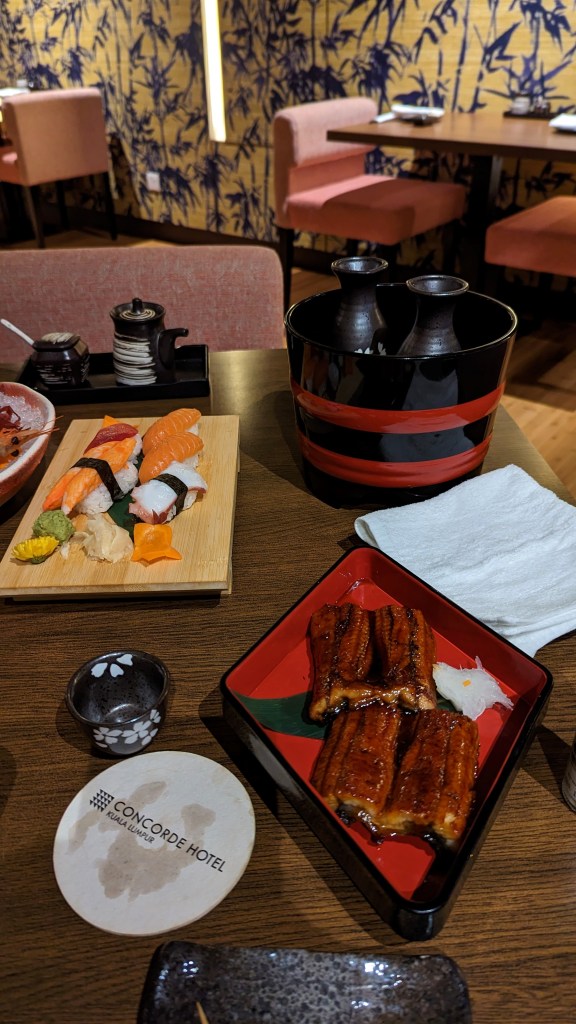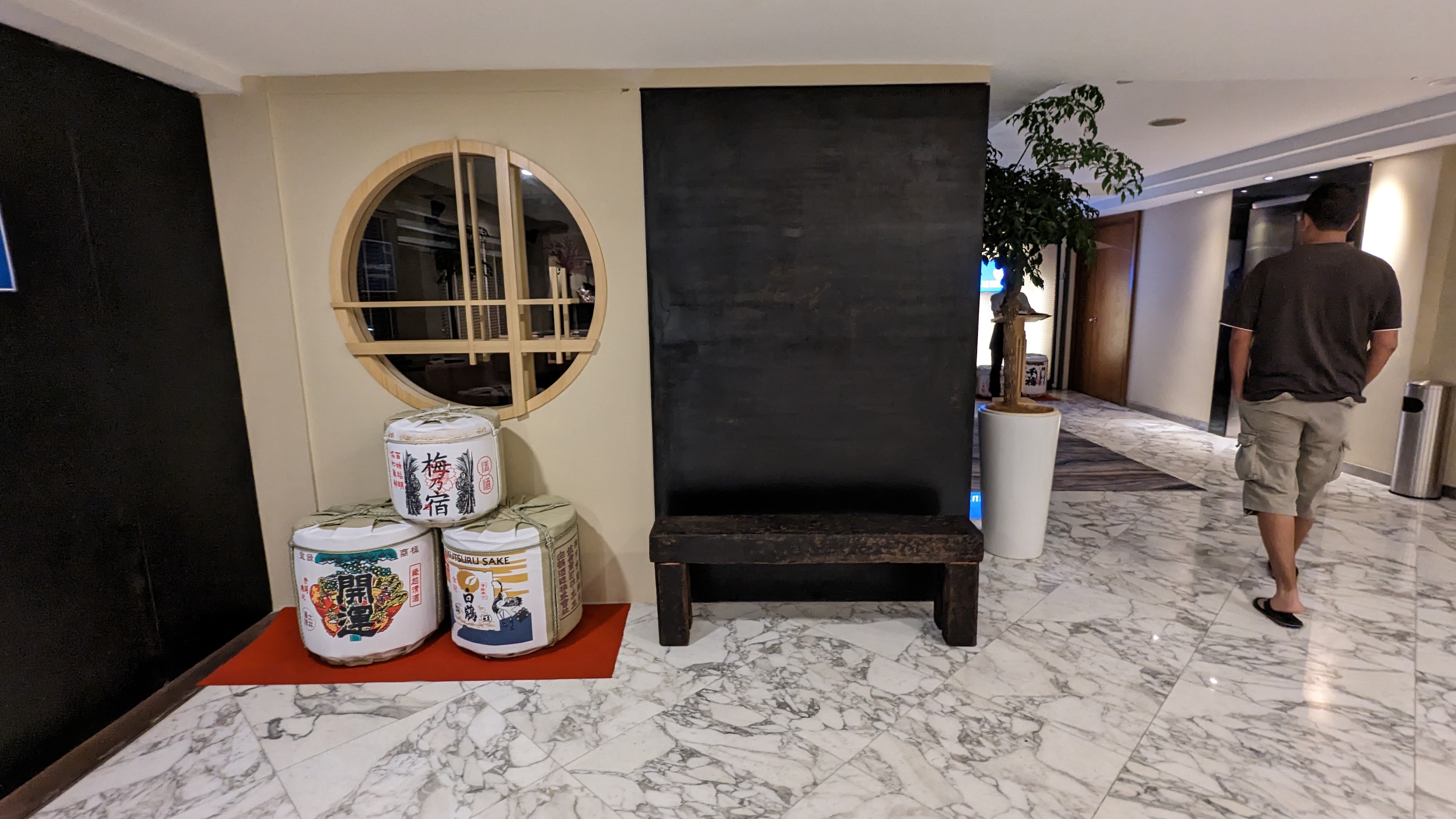 Retour à l’hôtel après cette longue journée de visite. Même si finalement nous n’avons pas tant marché que cela. Nous avons parcouru un peu moins de 13000 pas ce qui constitue l’une de nos plus petites marches du séjour. Mais avec la chaleur ça constitue quand même une belle journée et on a un peu la flemme de ressortir. Mais ça tombe bien, il y a un restaurant qui nous fait de l’œil depuis un moment. En effet, l’hôtel vient d’ouvrir un restaurant Japonais et en fait massivement la pub. Et c’est très appétissant. Ok, ok, on ne mange toujours pas local. Mais on se rapproche :).