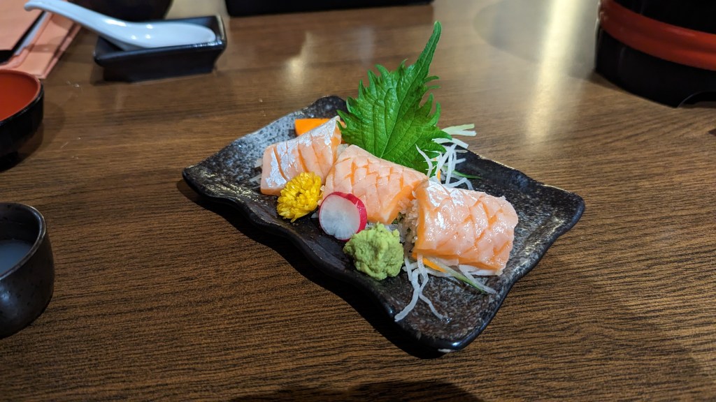 J’ai pris des sashimis (poisson cru découpé en tranches) à la carte et de l’unagi (de l’anguille). J’ai été un peu déçu par ce dernier. J’en eus un meilleur souvenir au Japon. L’anguille est normalement marinée dans la sauce Kabayaki et grillée au feu de bois. Ça lui donne du croustillant et un goût sucré/salé. Ici je pense qu’ils n’avaient pas la possibilité de les griller. Ou alors c’est un choix délibéré. En tout cas ce n’est pas croustillant mais gélatineux. J’ai aussi pris 1 sashimi toro. Oui juste 1. Il faut savoir se faire plaisir mais à 6€ la bouchée on reste modeste. Le toro, ou thon gras, est la partie ventrale des grands thons rouges. C’est donc un mets très cher mais délicieux. Je n’en ai pas mangé au Japon, mais à Las Vegas. Oui, nous avions mangé dans un restaurant un peu à l’image de celui-ci mais dans le Mandarin Oriental (excusez du peu). Et j’en eus gardé un très bon souvenir. Et bien ici, non … C’était très bon évidemment. Mais … non, pas autant que celui du Mandarin. J’ai été un peu déçu là aussi.