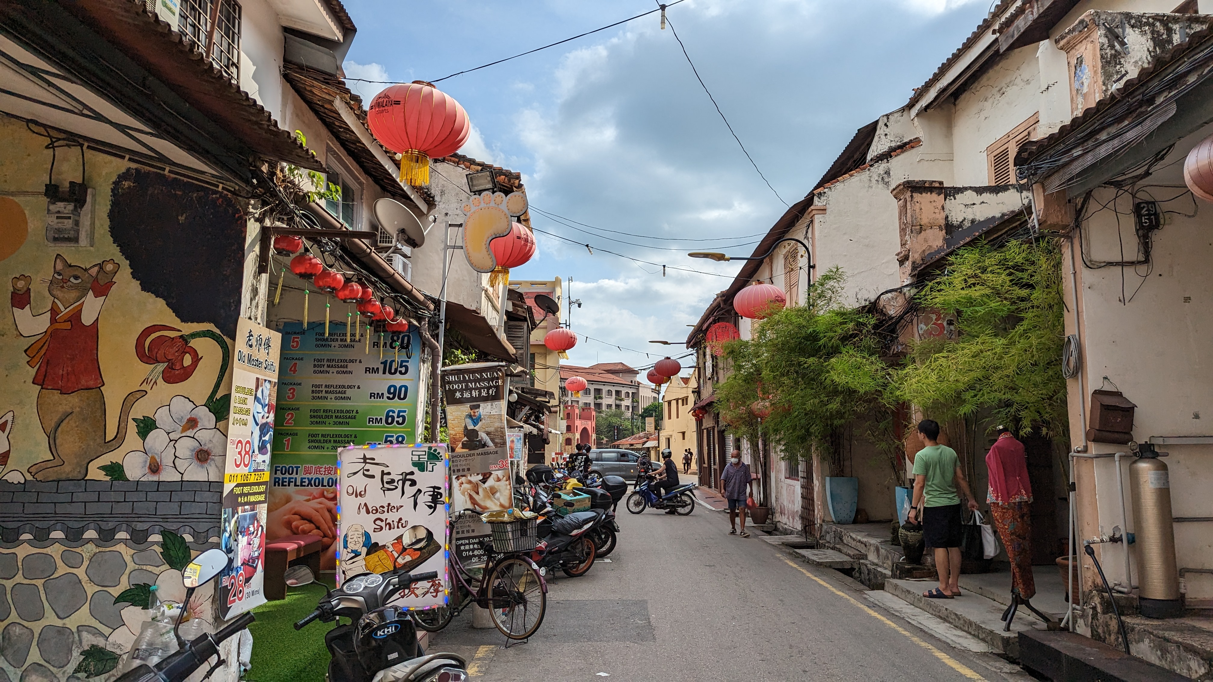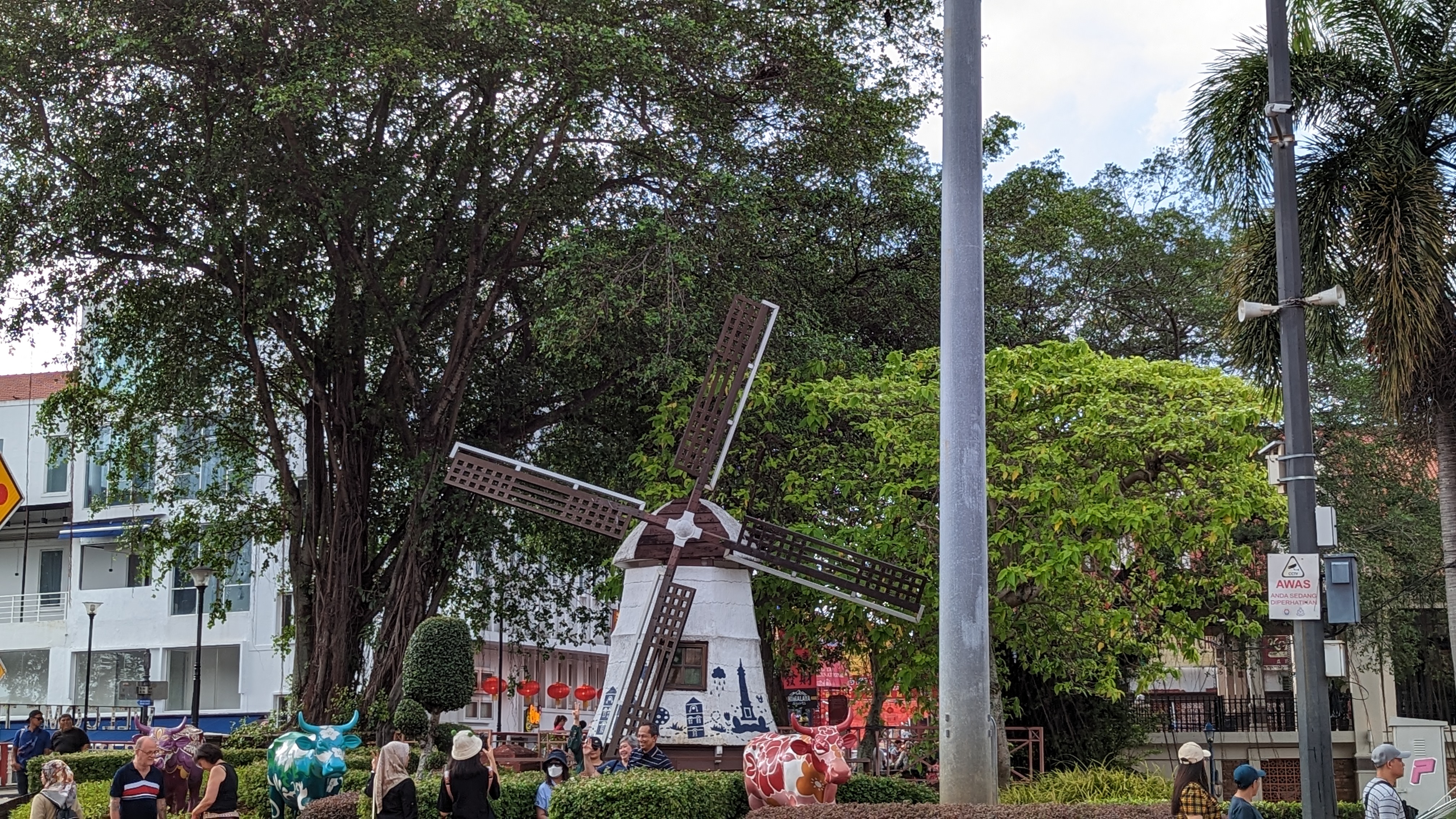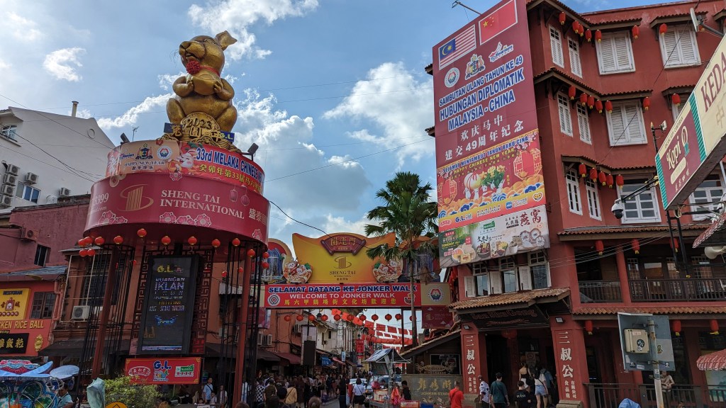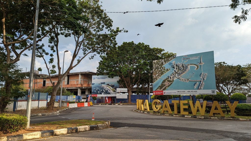 Nous voici donc arrivés à Malacca. Comme pour le départ, l’arrivée se fait bien entendu au terminal de bus. Nous n’avons strictement rien de prévu si ce n’est déambuler dans les rues de la ville. Nous ne sommes pas à côté du centre, mais la rivière de Malacca semble pas très loin. Autant donc commencer tout de suite à pied. Ce n’était finalement pas une bonne idée. Nous nous trouvons dans une zone commerciale de périphérie. Exactement comme en France, nous marchons donc de grand parking à grand parking. Nous arrivons ensuite dans un quartier qui semble totalement à l’abandon. Il y avait même un monorail, mais aujourd’hui ce n’est plus que le tableau d’un film dystopique. Alors que nous arrivons à l’extrémité du quartier, une grande roue rouillée nous laisse même l’impression de visiter Pripyat. Nous arrivons enfin au niveau de la rivière, mais toujours pas dans un plus beau décor. Il faudra marcher encore un peu avant d’enfin découvrir le centre coloré de Malacca. Cette marche aura donc été une perte de temps sur cette journée pourtant courte. Mais bon, au moins nous avons vu l’envers du décors. Maintenant que la vue est jolie et alors que nous n’avons toujours pas vraiment de but. Prenons le temps de nous rafraîchir au bord de ce cours d’eau tranquille, bien que sillonné par les allers et retours des bateaux touristiques.