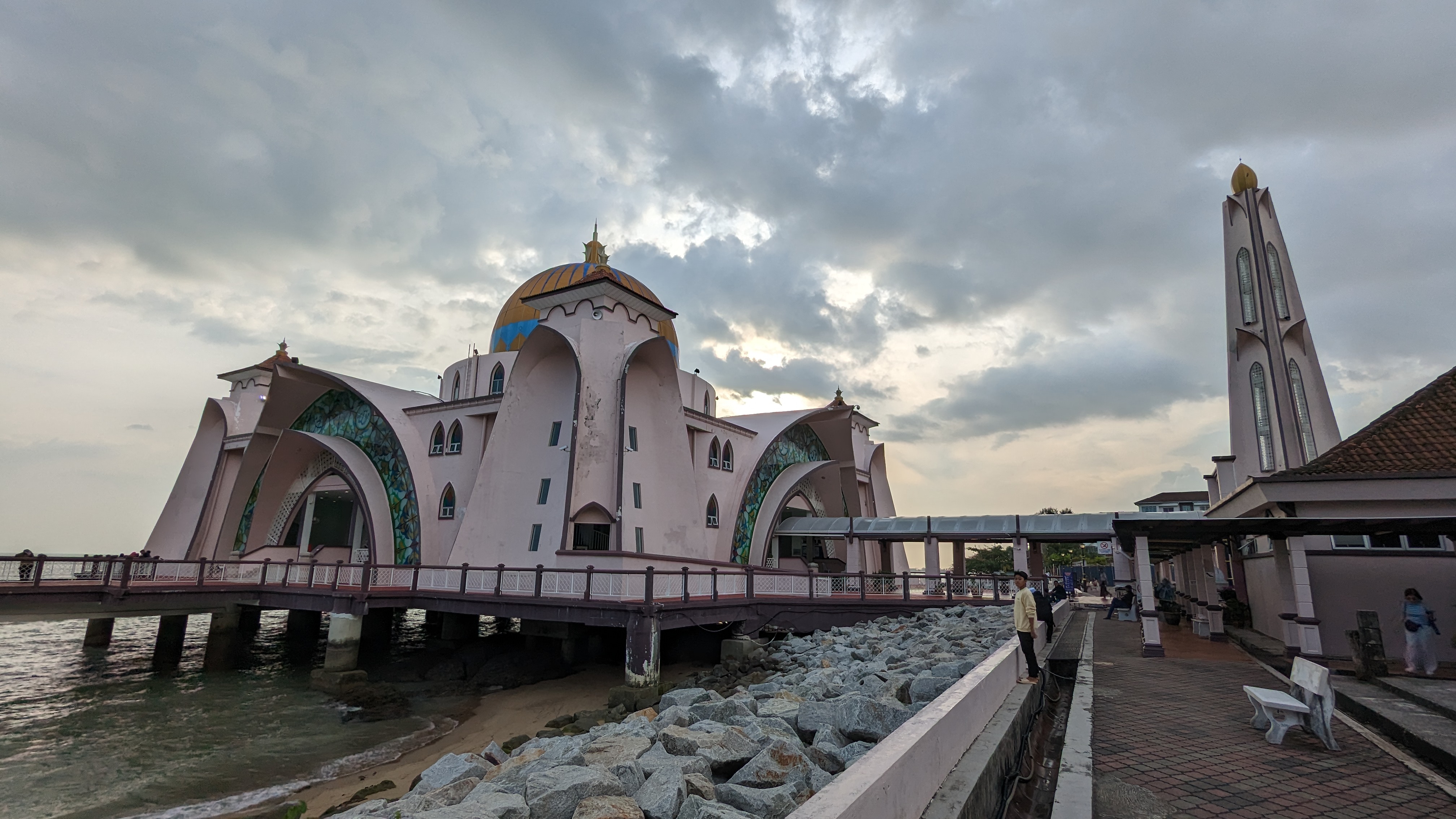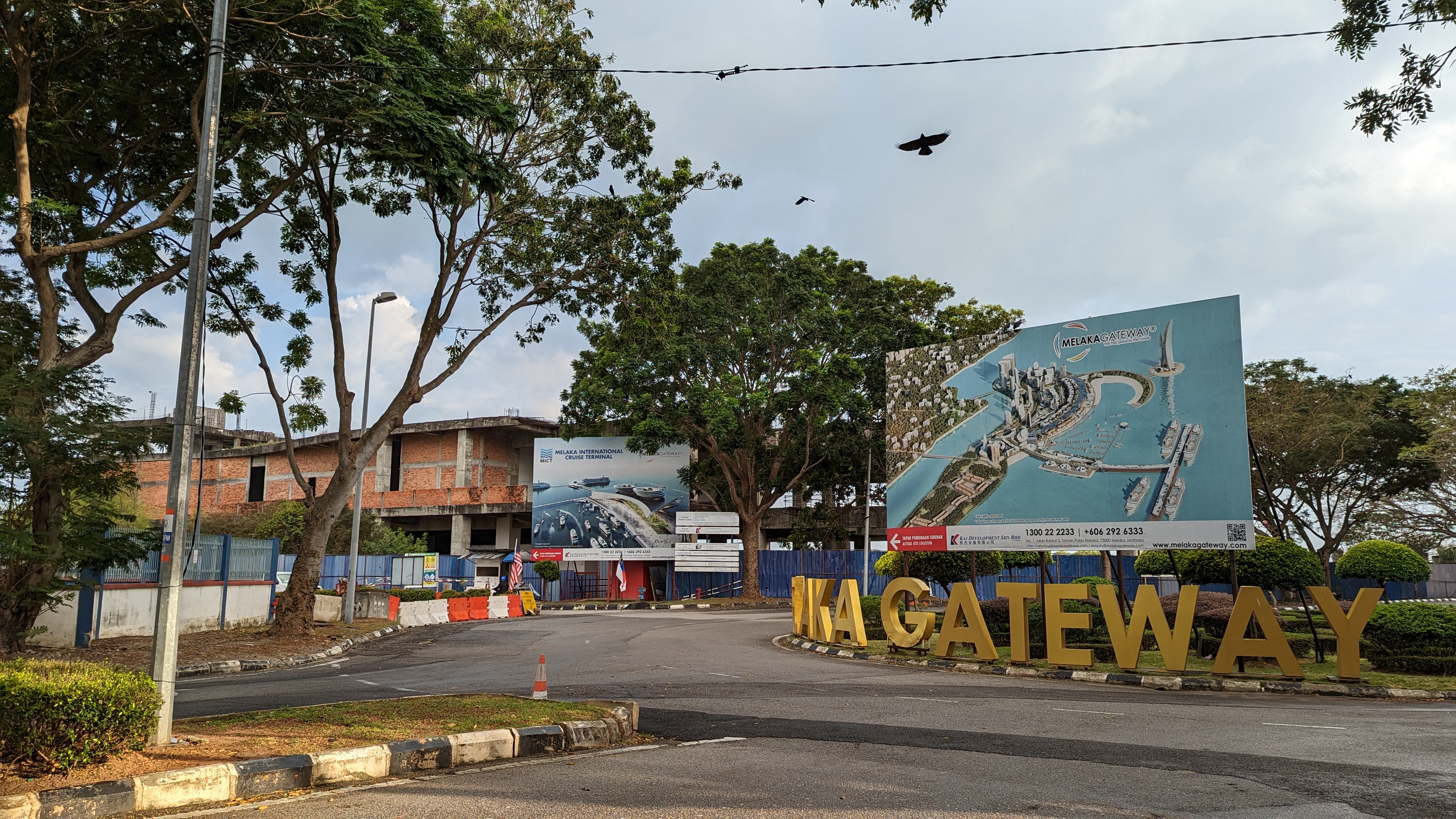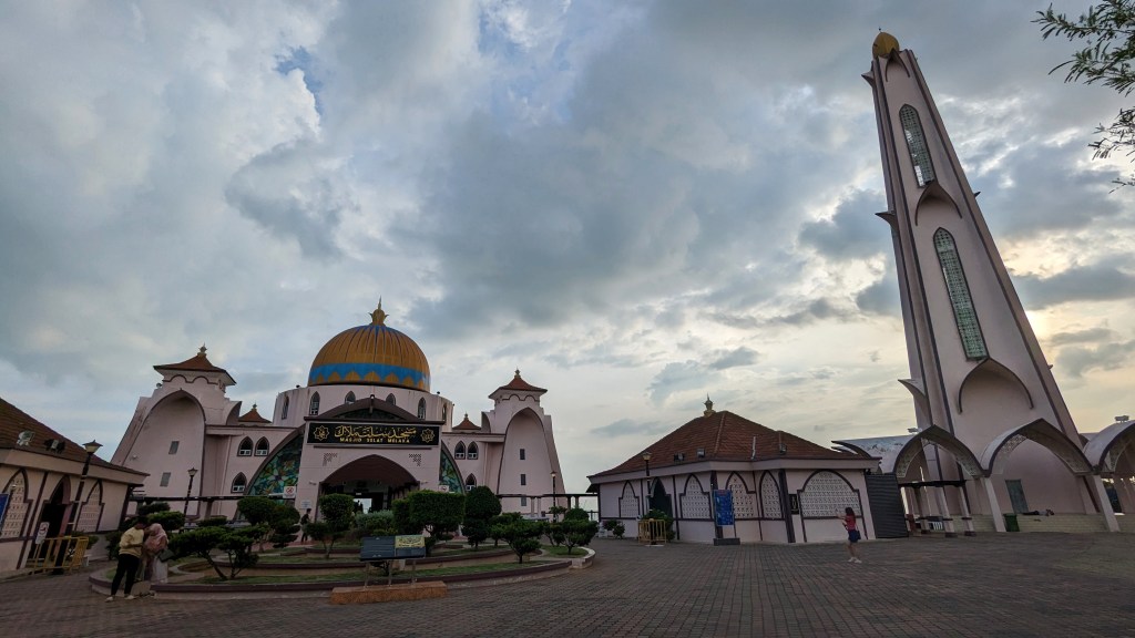 Il reste une dernière chose à voir ici. La mosquée Selat a la particularité d’être construite sur la mer. Nous continuons sur notre lancée et suivons donc le courant à pied pour espérer tomber sur la côte. Il n’en sera rien, la côte est inaccessible. Ce ne sera pas la première fois que nous ferons ce constat en Malaisie. A croire qu’ils n’aiment pas la mer. Nous allons donc devoir faire un grand détour avant d’enfin pouvoir approcher et traverser le pont menant à la petite île où se trouve la Mosquée. Nous hâtons le pas car nous sommes en fin d’après-midi et nous avons un bus retour qui nous attend. C’est aussi l’heure de la pluie. Cette fois-ci nous ne pouvons pas l’esquiver. J’ai bien un k-way dans le sac, mais avec cette chaleur il n’est pas agréable de se couvrir de plastique. Alors je préfère encore le rafraîchissement d’une bonne douche naturelle me servant quand même de l’imperméable pour protéger un peu le sac et les vêtements. L’île est elle aussi complètement à l’abandon. Nous traversons une ville fantôme. De grands panneaux dépeignent un futur radieux et luxueux. Sur la photo on se croirait à Dubaï. Mais pour l’instant, et j’imagine que la pandémie y est pour beaucoup, le futur a déjà pris la poussière. Nous arrivons enfin au bout de l’île. Nous aurions mieux fait de prendre le pousse-pousse Captain America. Nous avons peur d’être en retard. D’autant qu’il nous faut encore imprimer le billet de bus. Alors nous commandons tout de suite le Grab retour. Nous imaginons que lui aussi mettra du temps à venir aux confins de la ville. Mais il n’en est rien. Il était déjà là. Nous n’avons donc que quelques minutes pour prendre des photos et repartir. Passé 17h l’accès à l’intérieur est de toute façon fermé. Nous n’avons pas besoin de plus de temps.