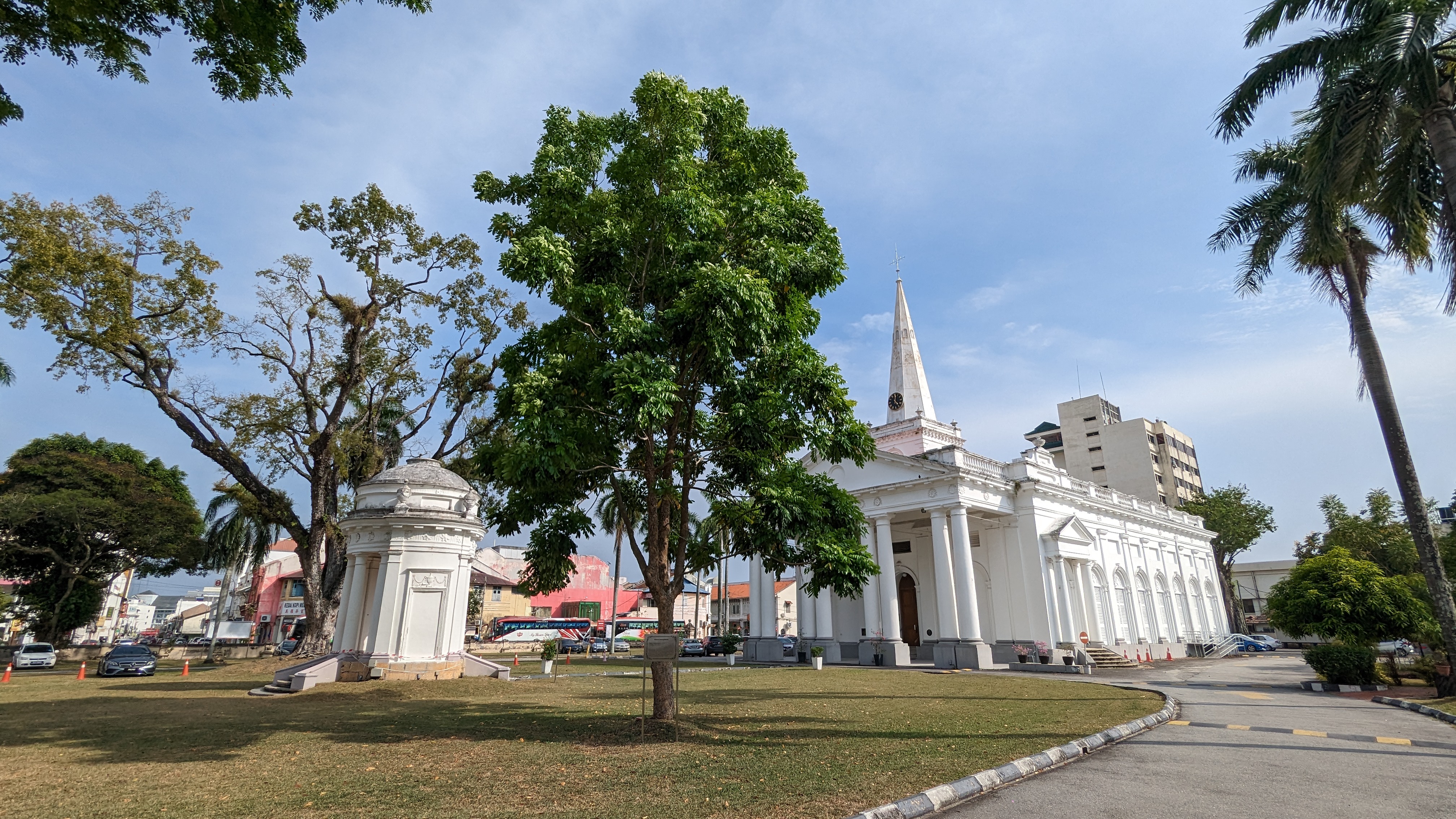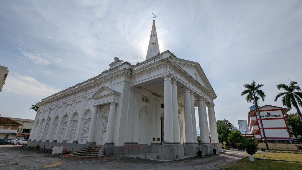 À quelques pas se trouve l’église Saint George. Terminée en 1818, il s’agit de la plus ancienne église anglicane de l’Asie du sud-est. Malheureusement, nous ne pourrons pas rentrer. Elle est fermée aujourd’hui. Pas les mercredis ou les mois d’avril ou les jours impairs je ne sais pas. Non elle est spécifiquement, et c’est bien marqué, fermée le 15 mars 2023. Tant pis, nous n’en verrons que l’extérieur rénové en 1948 après avoir souffert de l’invasion japonaise de la seconde guerre mondiale.