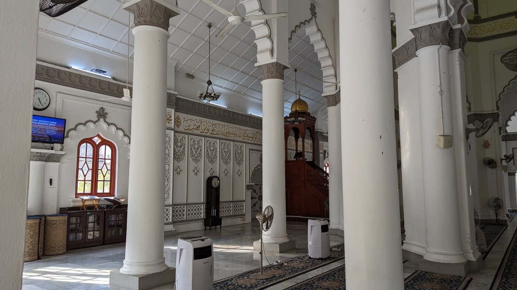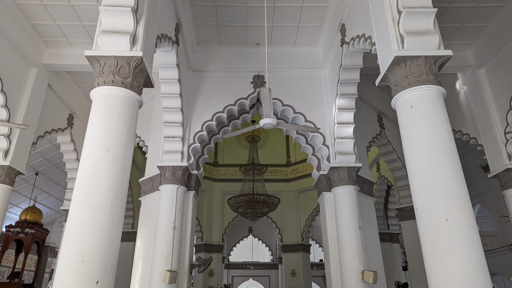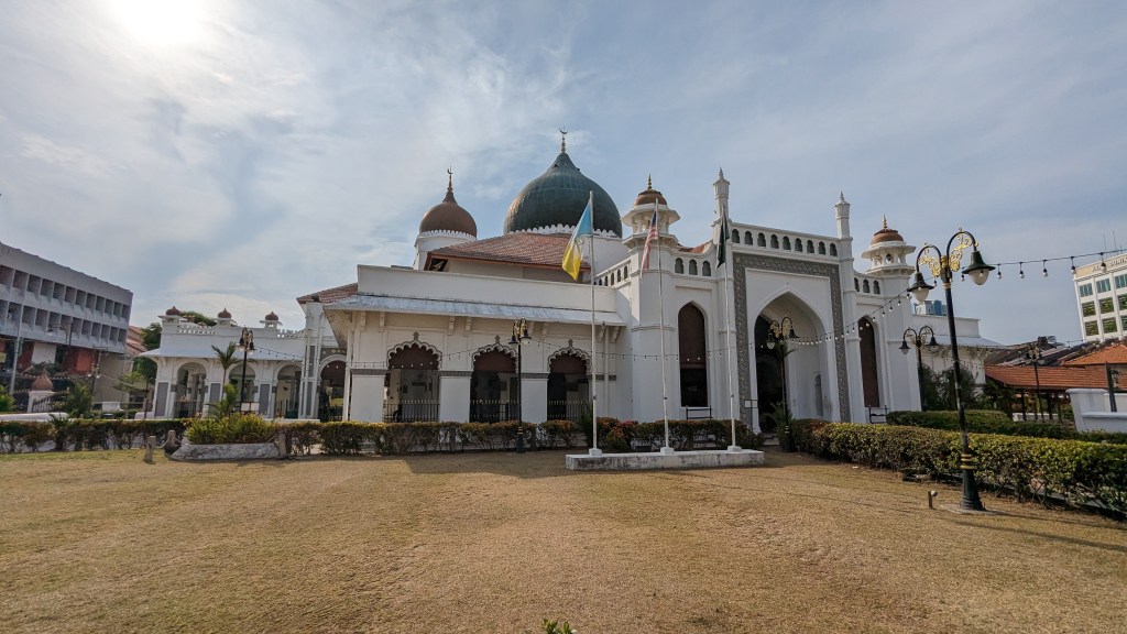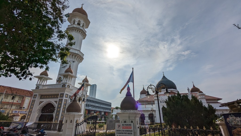 Nous terminons la rue avec la mosquée Kapitan Keling. Elle tire son nom de la communauté indienne qui l’a construite en 1801. Alors que nous nous approchons, une guide de l’établissement nous propose gratuitement de nous en faire le tour. Et ainsi nous avons quelques explications sur la pratique de l’islam.