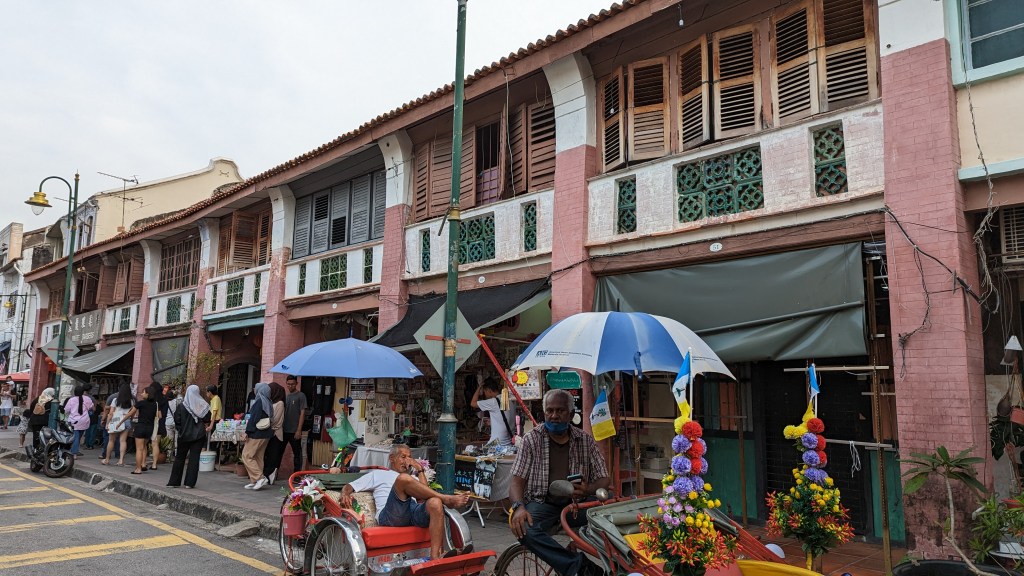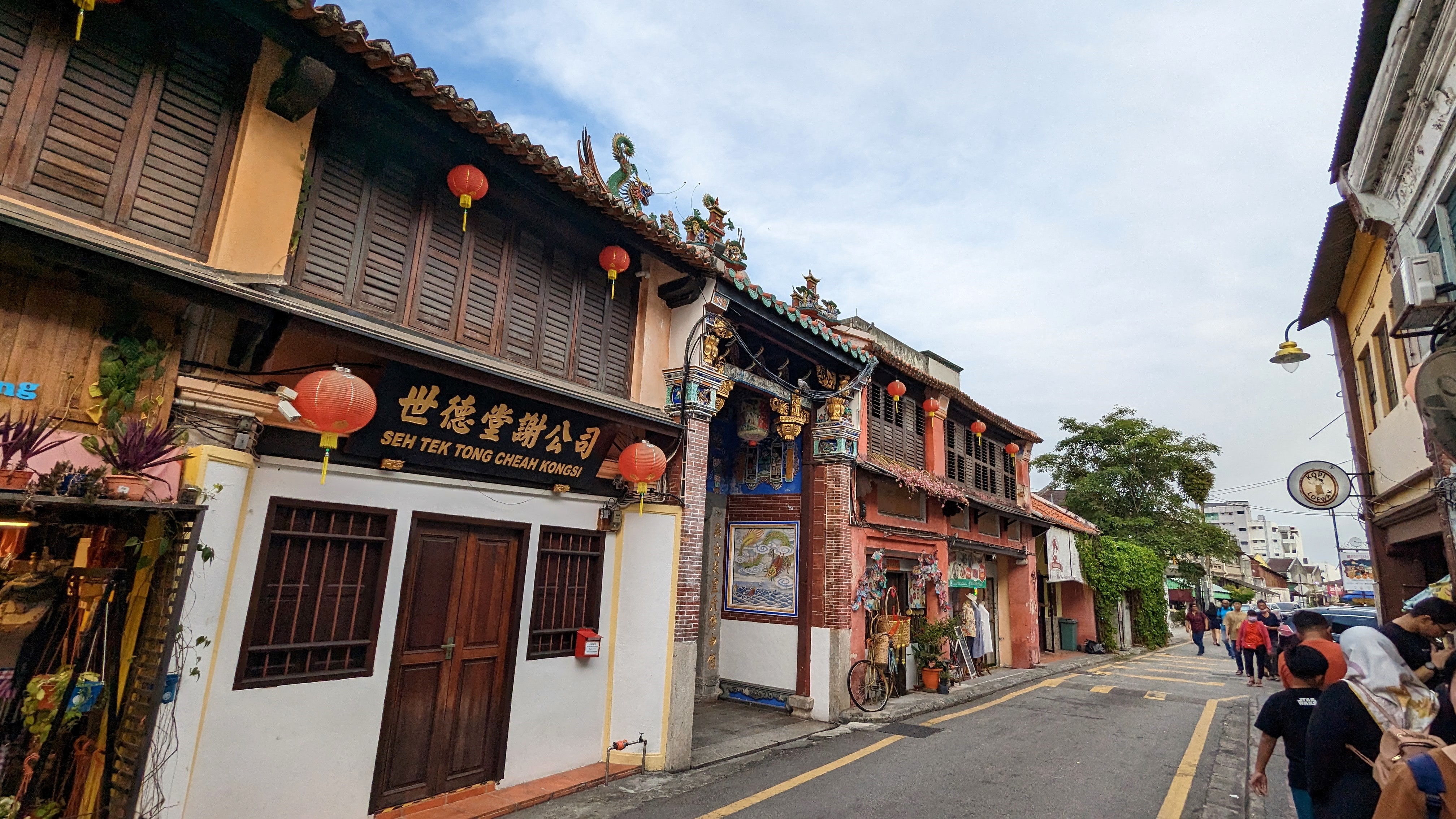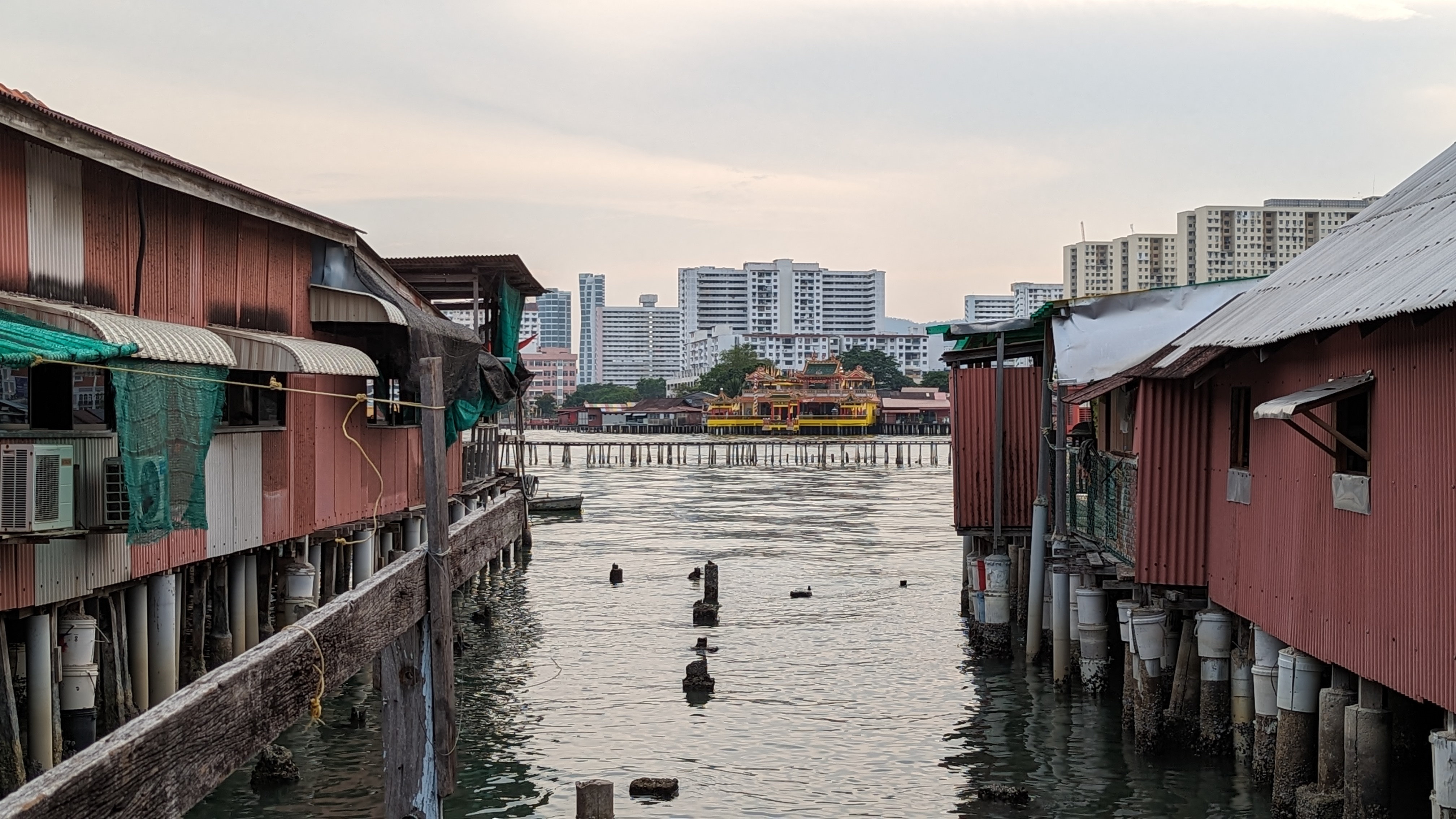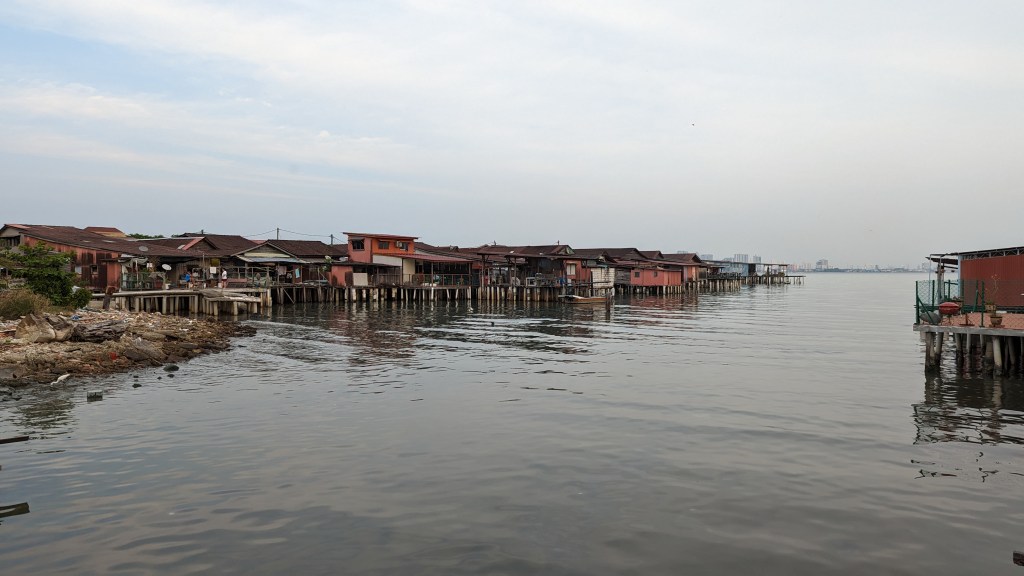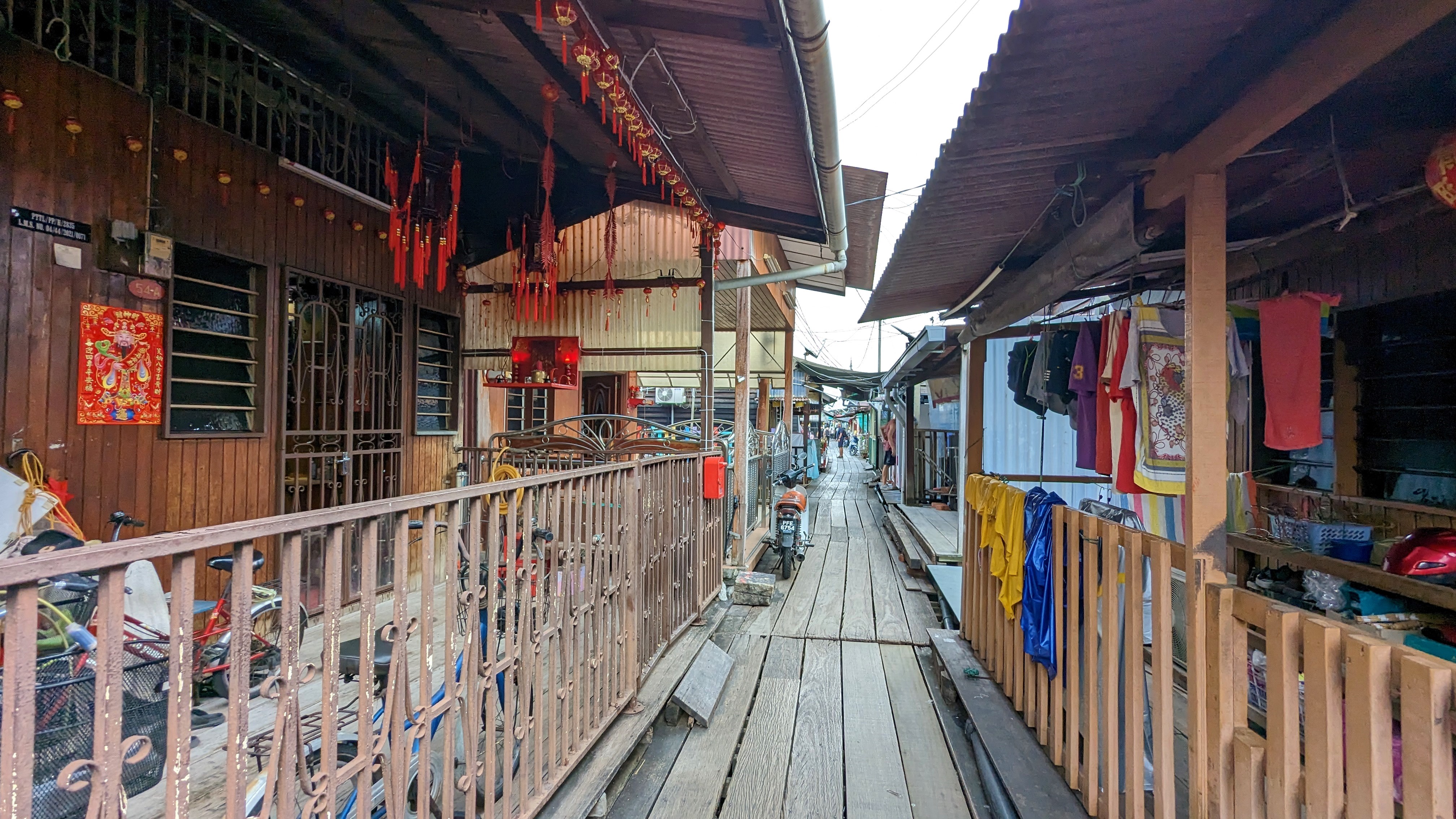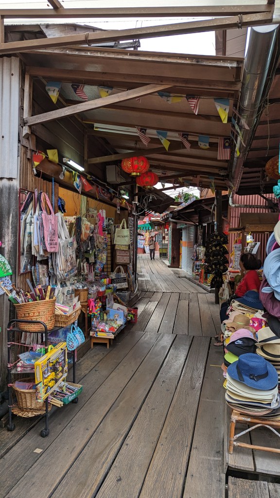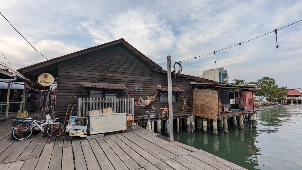 Et nous voila arrivés en bord de mer sur Chew Jetty. Il s’agit d’un petit quartier construit sur une jetée, sur pilotis donc, par le clan Chew. Il y en a plusieurs sur le front de mer et tous de clan différent. Comme on peut le remarquer dès l’entrée avec les boutiques, c’est aujourd’hui un lieu très touristique. Mais certaines maisons sont cependant toujours habitées. Vu l’âge des occupants, je doute que ce soit encore le cas bien longtemps si vous voulez mon avis.