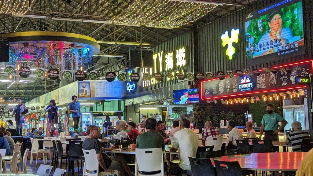 Nous n’allons quand même pas nous contenter de manger liquide. Alors nous décidons de nous rendre au food-court que nous avons croisé en face de la jetée. Et c’est une bonne idée. J’adore l’ambiance qui y règne. Il y a même des chanteurs sur la scène qui reprennent en chinois des morceaux asiatiques. Un grand écran permet de les suivre en karaoké. Personne ne le fait ceci-dit. Je n’ai reconnu que « Gentleman » du chanteur coréen « Psy ». On se sent un peu comme dans une fête de quartier. Je me rend au bar pour accompagner le repas d’une dernière bière, mais il n’y a personne. J’ai peur qu’il soit déjà trop tard et que les fûts soient vides. Mais un vendeur voisin me remarque et vient me voir. « Hey, tu veux une bière ? ». Euh ben oui oui. Puis il repart en hurlant « IL VEUT UNE BIÈRE » et déambule ainsi dans le hall. Il finit par retrouver le propriétaire quelques mètres plus loin et se dirige vers lui toujours en hurlant. Du coup, le barman avisé vient me servir une Connor’s. Ils ont le sens de l’entraide et du service ici 🙂.