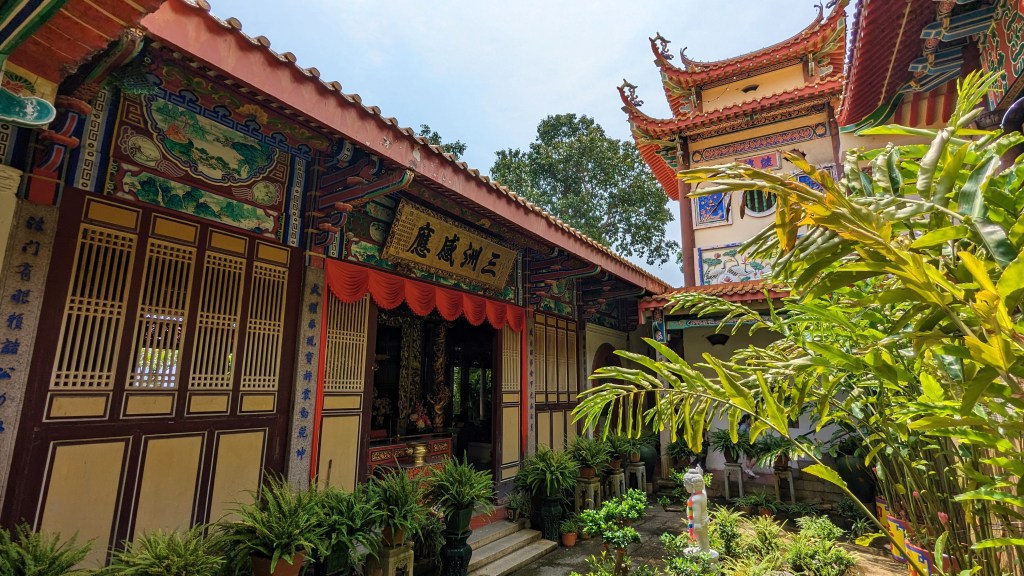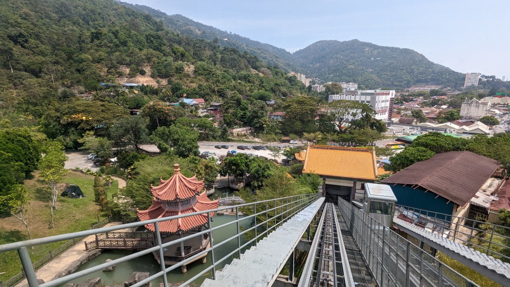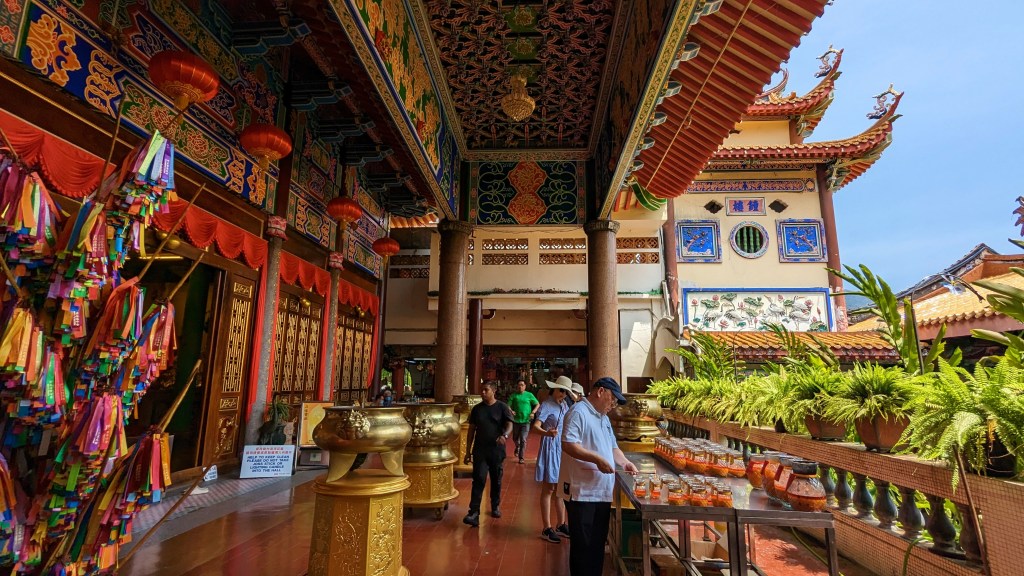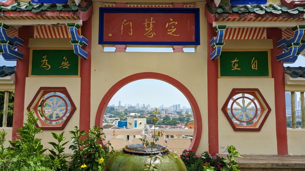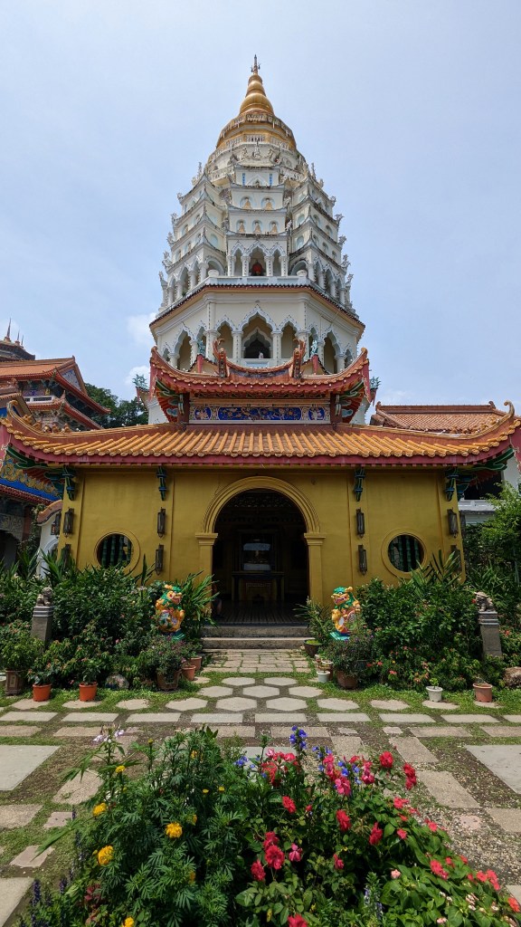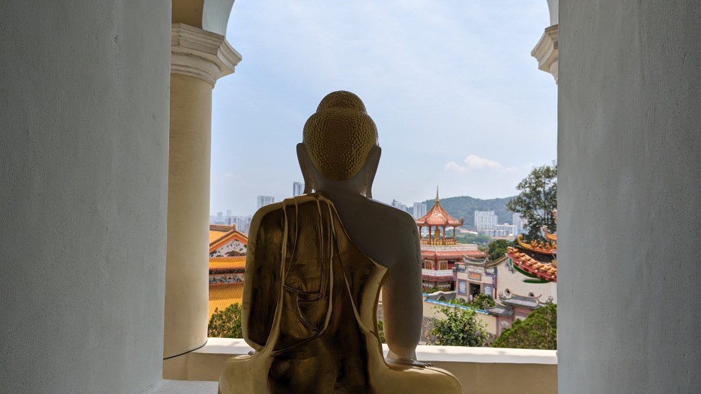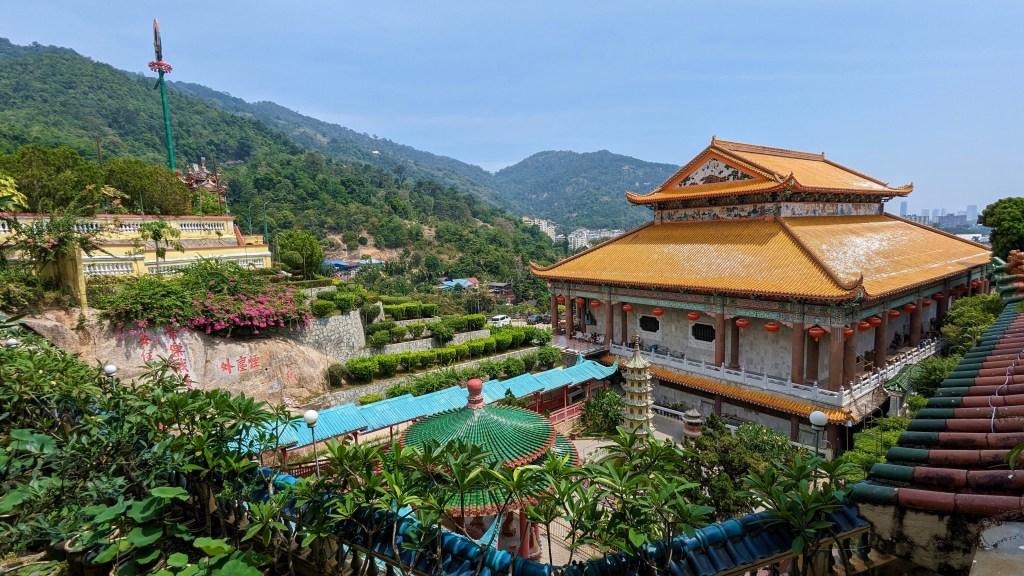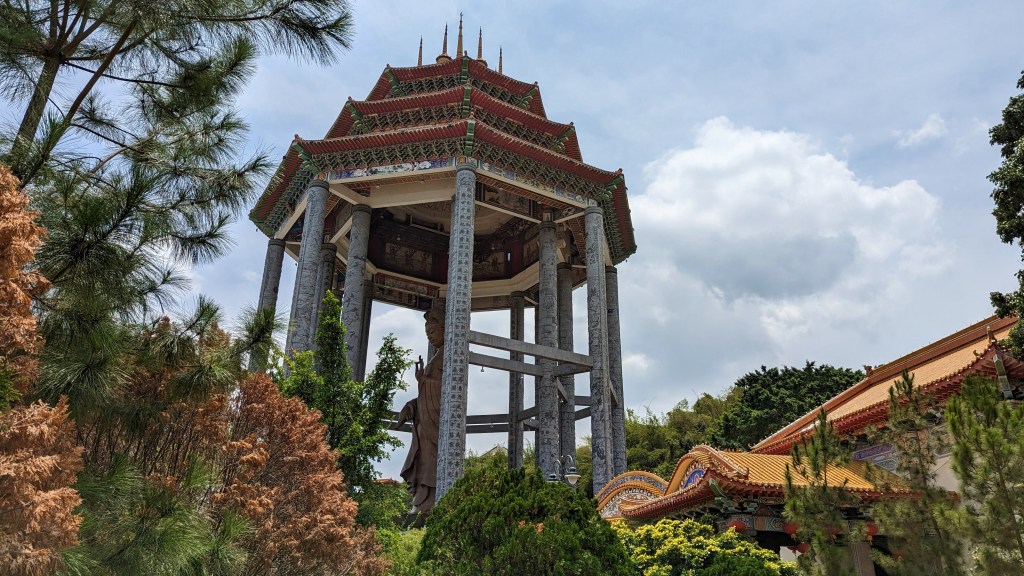 Et la voici cette statue de près de 37m de la déesse Guanyin. Elle adopte la même posture que dans le petit temple de Gua Musang. Nous ne pouvons malheureusement pas entrer dans le pavillon pour être à ses pieds. Mais ça va, on la voit quand même 😂.