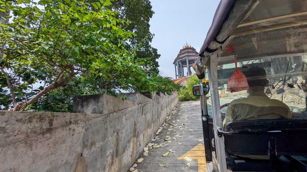Premier jour sur l’île de Penang. Nous n’avons rien préparé. Comme nous avons encore la voiture, je regarde un peu ce que nous pouvons faire en périphérie de la ville. Et en parlant de périphérie , il y a quelque chose qui m’intrigue depuis hier soir. Avec la vue incroyable de notre appartement, il y a quelque chose que nous ne pouvons pas rater. Sur le flanc de la colline se dresse une titanesque statue. En cherchant sur Maps je constate qu’il s’agit d’un grand temple qui m’a l’air bien sympa. Alors c’est parti, direction le temple Kek Lok Si. Le plus grand temple Bouddhiste de Malaisie. Sur la route, nous croisons le regard d’un Seven Eleven qui nous fait un petit clin d’œil. Nous prenons donc le temps d’acheter le petit déjeuner avant de poursuivre.