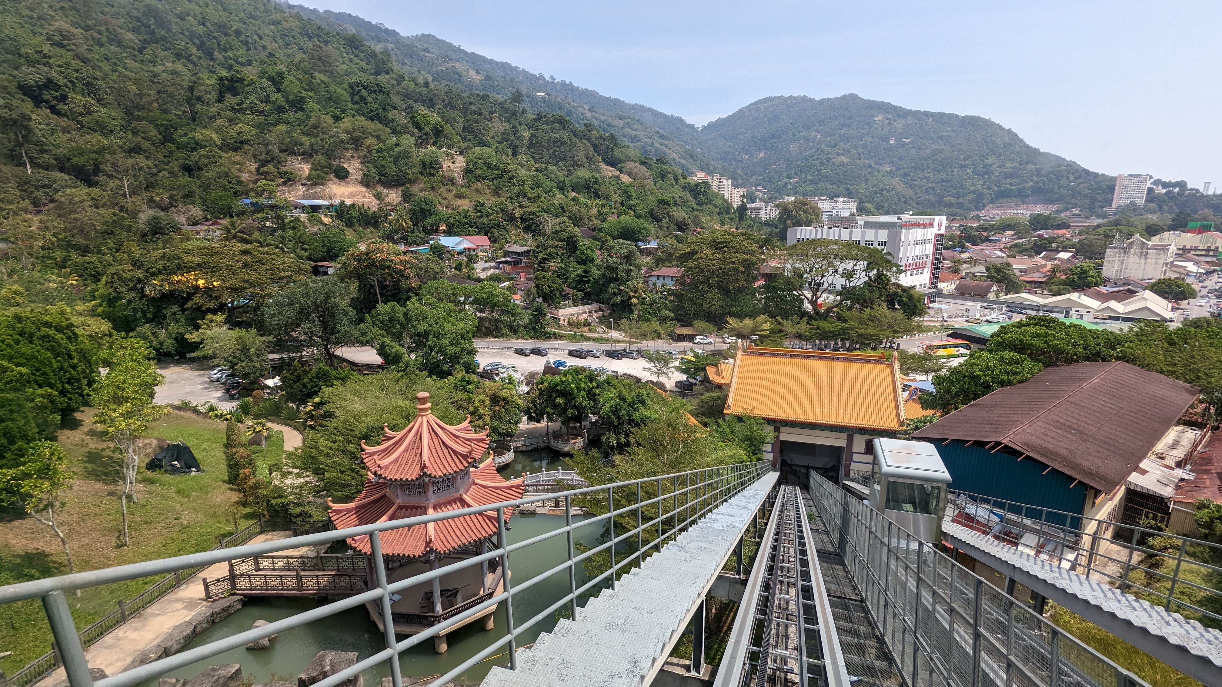 Nous avons une belle vue sur tout le temple du haut de la pagode. Et la statue commence à se montrer. Alors allons la saluer. Pour cela nous empruntons un nouveau funiculaire et arrivons au dernier niveau. Il y a ici également un grand parking. Il est donc possible de commencer un peu où on veut.