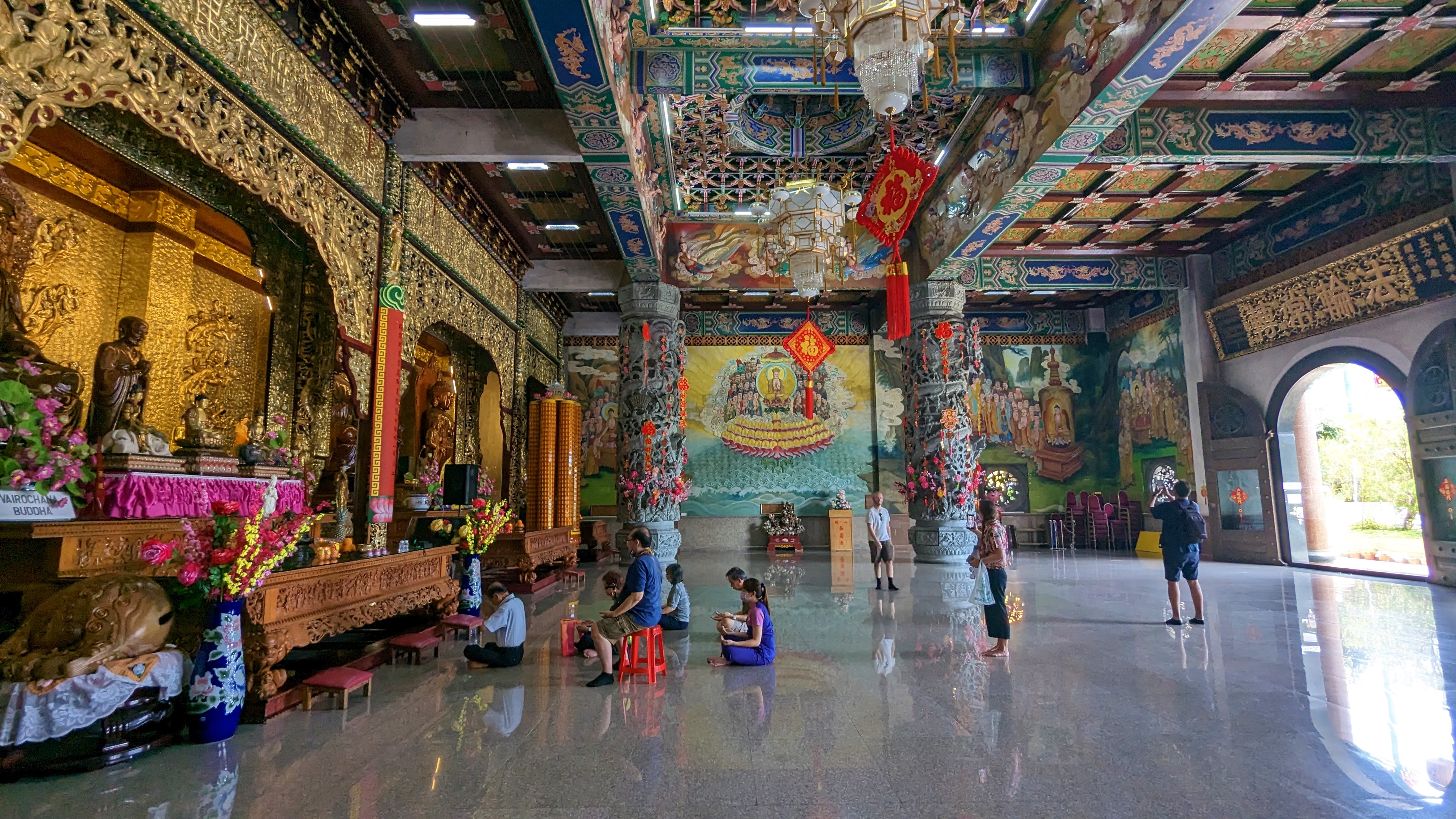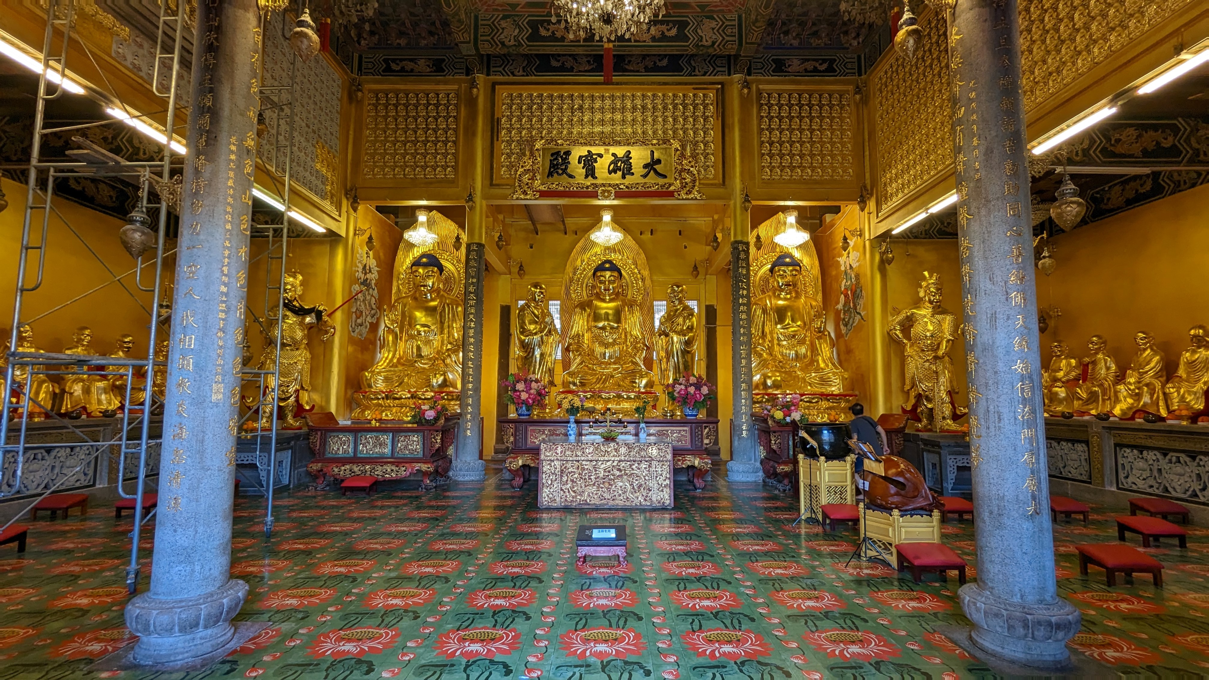Et nous voici arrivés au niveau principal de prière. Et, comme j’avais cru comprendre en regardant sur Google, c’est magnifique ! Et même encore plus que ce que j’aurais pu croire. Enfin en fait on commence par la boutique donc ce n’est pas encore l’émerveillement mais ça va venir très vite. Il y a en un partout d’ailleurs des boutiques, mais celle de l’entrée c’est un supermarché Bouddhiste. Il faut dire que cela permet de financer les travaux. Car, si la construction du temple a officiellement pris fin en 1930 après 40 ans, il est toujours aujourd’hui en extension et rénovation. Après la boutique donc, nous pouvons déjà visiter une partie du temple. Mais le reste, dont la salle principale de prière et la pagode, sont à accès payant. Et oui encore une fois, pour l’instant nous n’avons pas acheté de billet d’entrée. Nous aurions pu venir à pied et nous affranchir de payer pour le funiculaire. Mais cela aurait été dommage. L’expérience était sympa. Et de toute façon, l’entrée que nous payons maintenant et le funiculaire nous auront coûté que 3,75€ par personne.