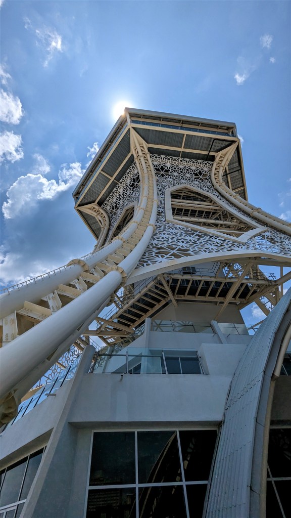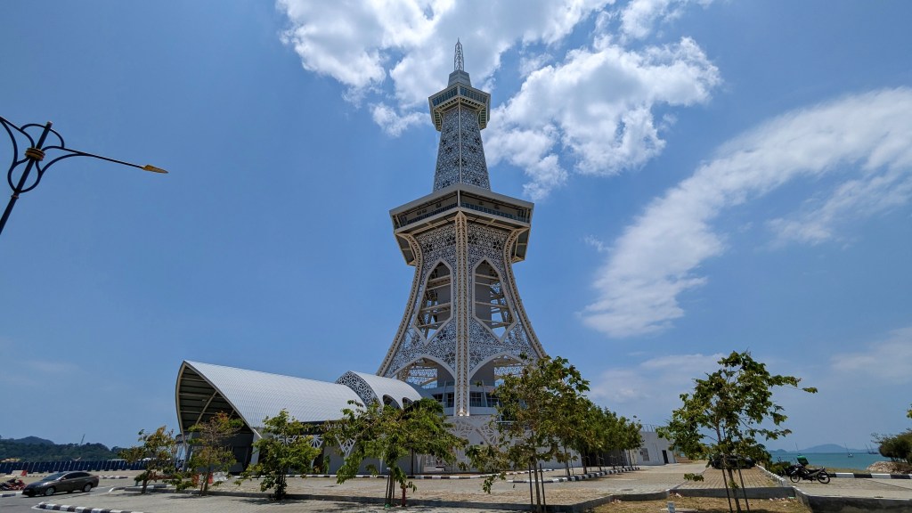 En chemin, nous tombons sur une plage. Par cette chaleur, un petit plongeon ne ferait pas de mal. Heureusement, nous avions prévu les maillots de bain dans le sac à dos. Une fois changé, nous nous approchons de l’eau et finalement bof. C’est de la caillasse et ce n’est pas très beau. Non, finalement nous n’y allons pas. En ressortant par l’autre extrémité, nous découvrons un panneau « baignade interdite ». Ah ben on a bien fait de ne pas y aller alors. Je ne sais pas si c’est à cause des méduses ou autre. Bref, nous poursuivons jusqu’à la tour. Elle est vraiment toute neuve. Elle a été inaugurée fin 2022 et mesure 138 m de haut. Et s’il n’y avait pas grand monde à l’aigle. Il n’y a ici personne ! Mais vraiment pas un chat. Il y a juste un vigile qui doit franchement trouver le temps long ainsi que les guichetiers à l’intérieur. En plus les pauvres, ils ont dû avoir les yeux qui brillent en nous voyant arriver, mais nous ne sommes même pas monté. C’était quand même une quinzaine d’euros pour aller au sommet (de ce que je vois sur leur site, ils ont baissé les prix). Et franchement nous ne voyons pas l’intérêt de prendre de la hauteur ici. Nous étions à 600 mètres hier alors 100 aujourd’hui bof. Il n’y a rien à voir, c’est la mer. Alors nous allons nous contenter de prendre des boissons au Seven Eleven qui se trouve au pied de la tour (des champignons je vous dit). Alors par contre, ce qu’on ne peut pas leur retirer, c’est qu’elle est très belle cette tour. Ses formes rappellent bien-sûr la tour Eiffel. Et de plus près nous voyons bien l’inspiration Islamique avec ces motifs qui font penser à un minaret.