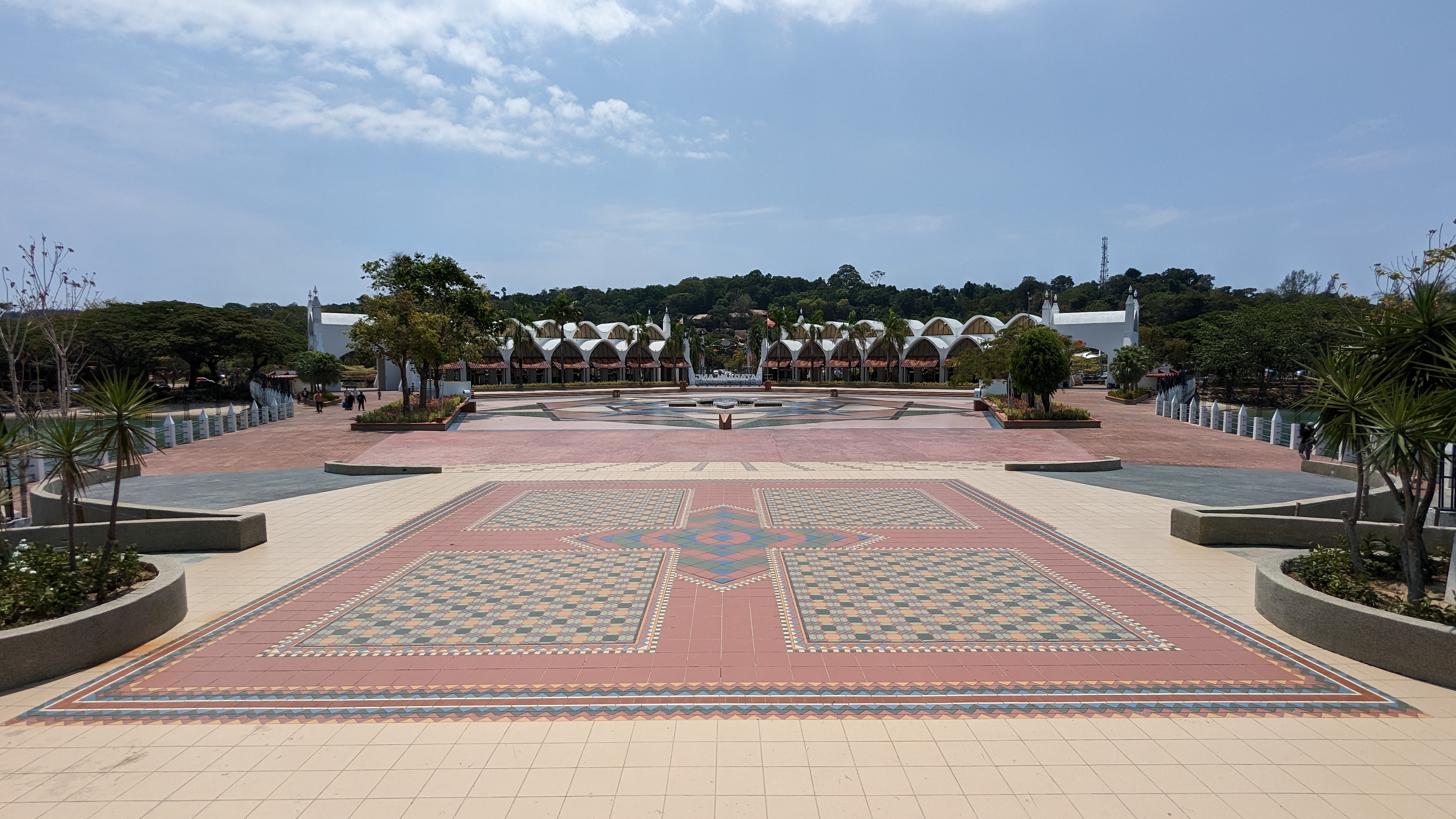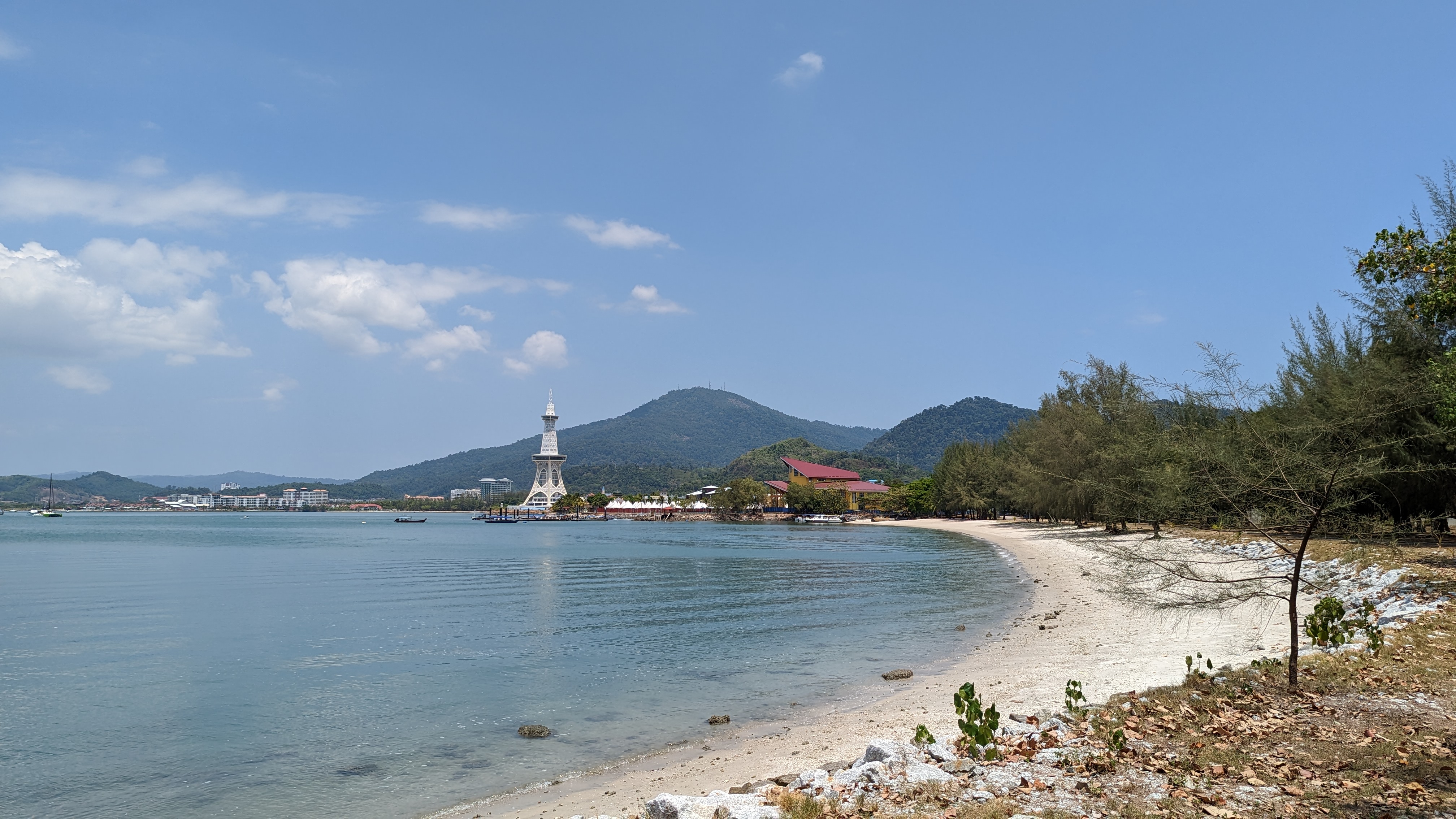 L’aigle est la mascotte de l’île. Pour une raison simple, j’ai eu l’occasion d’en voir dans les cieux. Alors ils ont eu l’idée de construire une grande statue à l’image de cet animal majestueux. Ce lieu est sur toutes les cartes touristiques comme si c’était un incontournable. Alors allons voir ce fameux piaf. Il se trouve sur la partie est de l’île, au niveau du terminal des ferrys. Comme nous sommes plutôt à l’ouest, au niveau de l’aéroport, nous appelons un Grab. Et je pense que nous arrivons sur la partie un peu plus ancienne de l’île. D’où la présence du port, premier moyen d’accès. Mais les plages ne sont pas aussi belles que celles de l’ouest et c’est donc bien moins touristique. J’ai le sentiment qu’ils ont justement construit ce point d’intérêt ici pour attirer les visiteurs or de leurs hôtels. Mais ça n’a pas un franc succès. Nous sommes plutôt tranquilles ici. Ils feraient mieux de construire un monorail ou quelque chose comme ça pour déplacer les touristes. Du coup, vide, ça donne une atmosphère pauvre. Mais c’est pourtant joli. Ça vaut le coup d’œil.