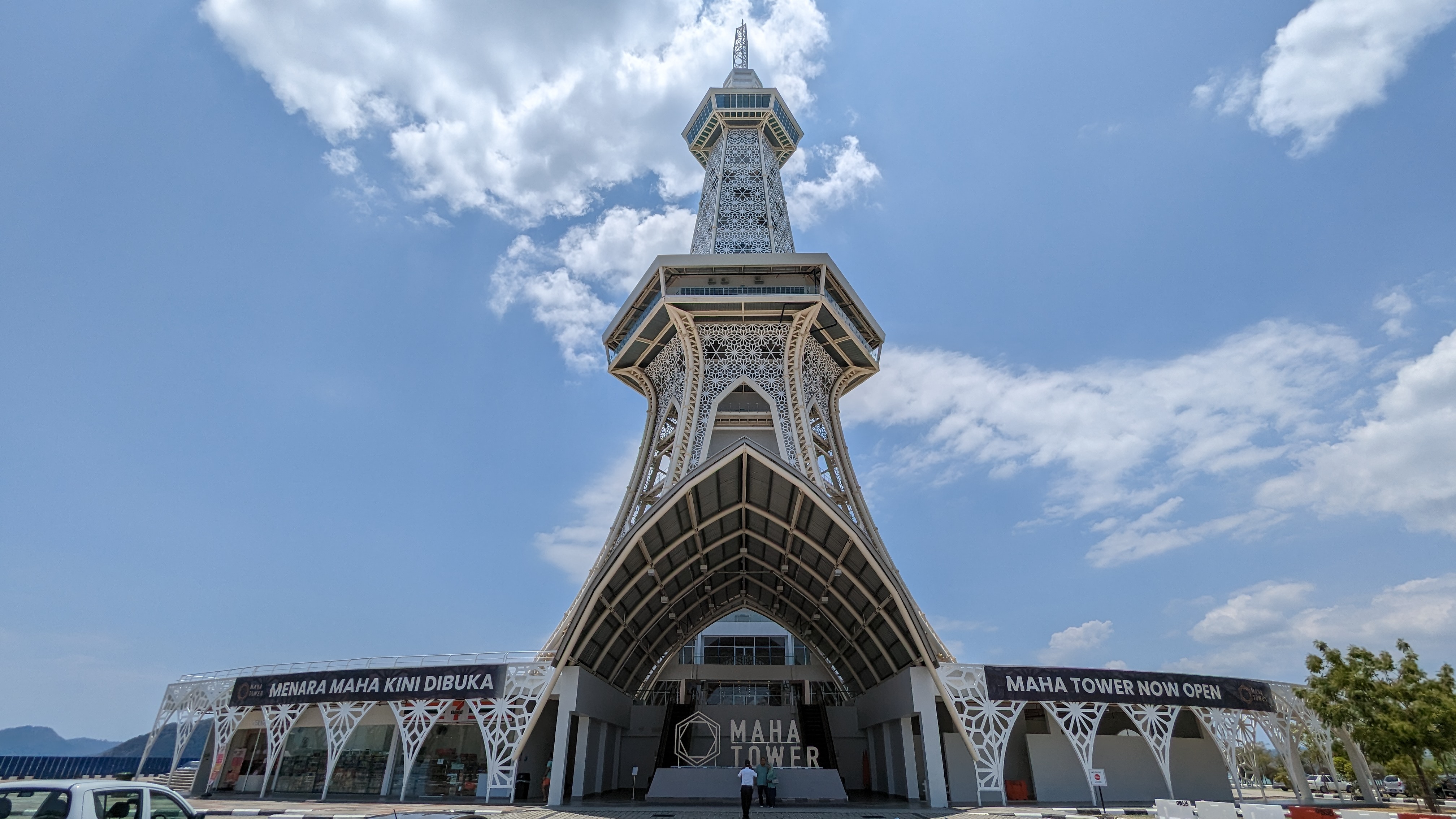 En chemin, nous tombons sur une plage. Par cette chaleur, un petit plongeon ne ferait pas de mal. Heureusement, nous avions prévu les maillots de bain dans le sac à dos. Une fois changé, nous nous approchons de l’eau et finalement bof. C’est de la caillasse et ce n’est pas très beau. Non, finalement nous n’y allons pas. En ressortant par l’autre extrémité, nous découvrons un panneau « baignade interdite ». Ah ben on a bien fait de ne pas y aller alors. Je ne sais pas si c’est à cause des méduses ou autre. Bref, nous poursuivons jusqu’à la tour. Elle est vraiment toute neuve. Elle a été inaugurée fin 2022 et mesure 138 m de haut. Et s’il n’y avait pas grand monde à l’aigle. Il n’y a ici personne ! Mais vraiment pas un chat. Il y a juste un vigile qui doit franchement trouver le temps long ainsi que les guichetiers à l’intérieur. En plus les pauvres, ils ont dû avoir les yeux qui brillent en nous voyant arriver, mais nous ne sommes même pas monté. C’était quand même une quinzaine d’euros pour aller au sommet (de ce que je vois sur leur site, ils ont baissé les prix). Et franchement nous ne voyons pas l’intérêt de prendre de la hauteur ici. Nous étions à 600 mètres hier alors 100 aujourd’hui bof. Il n’y a rien à voir, c’est la mer. Alors nous allons nous contenter de prendre des boissons au Seven Eleven qui se trouve au pied de la tour (des champignons je vous dit). Alors par contre, ce qu’on ne peut pas leur retirer, c’est qu’elle est très belle cette tour. Ses formes rappellent bien-sûr la tour Eiffel. Et de plus près nous voyons bien l’inspiration Islamique avec ces motifs qui font penser à un minaret.