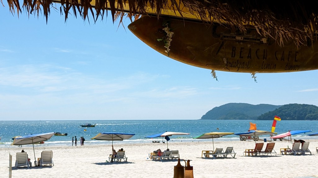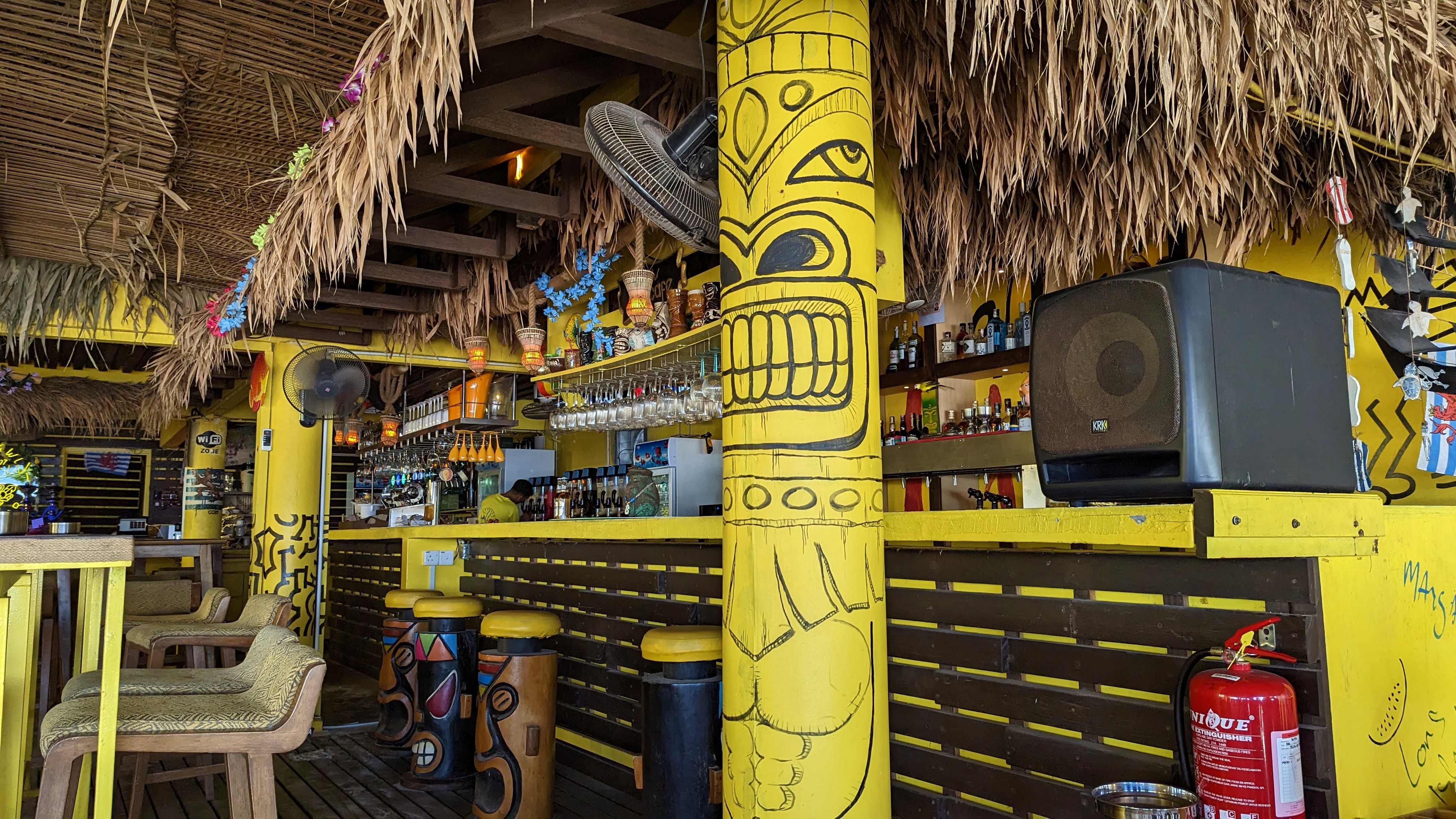 La sortie de l’aquarium donne directement dans le magasin duty free. Il est vraiment grand et propose de tout. On se croit déjà à l’aéroport. Mais ce n’est pas le cas. Nous avons encore une après-midi à tuer. Du coup ben… direction le Yellow Bar. Il fait super beau et chaud. Stephan finit par craquer et va piquer une dernière tête dans la mer. Mais je résiste. C’est surtout l’idée d’être plein de sel dans l’avion qui me retient.