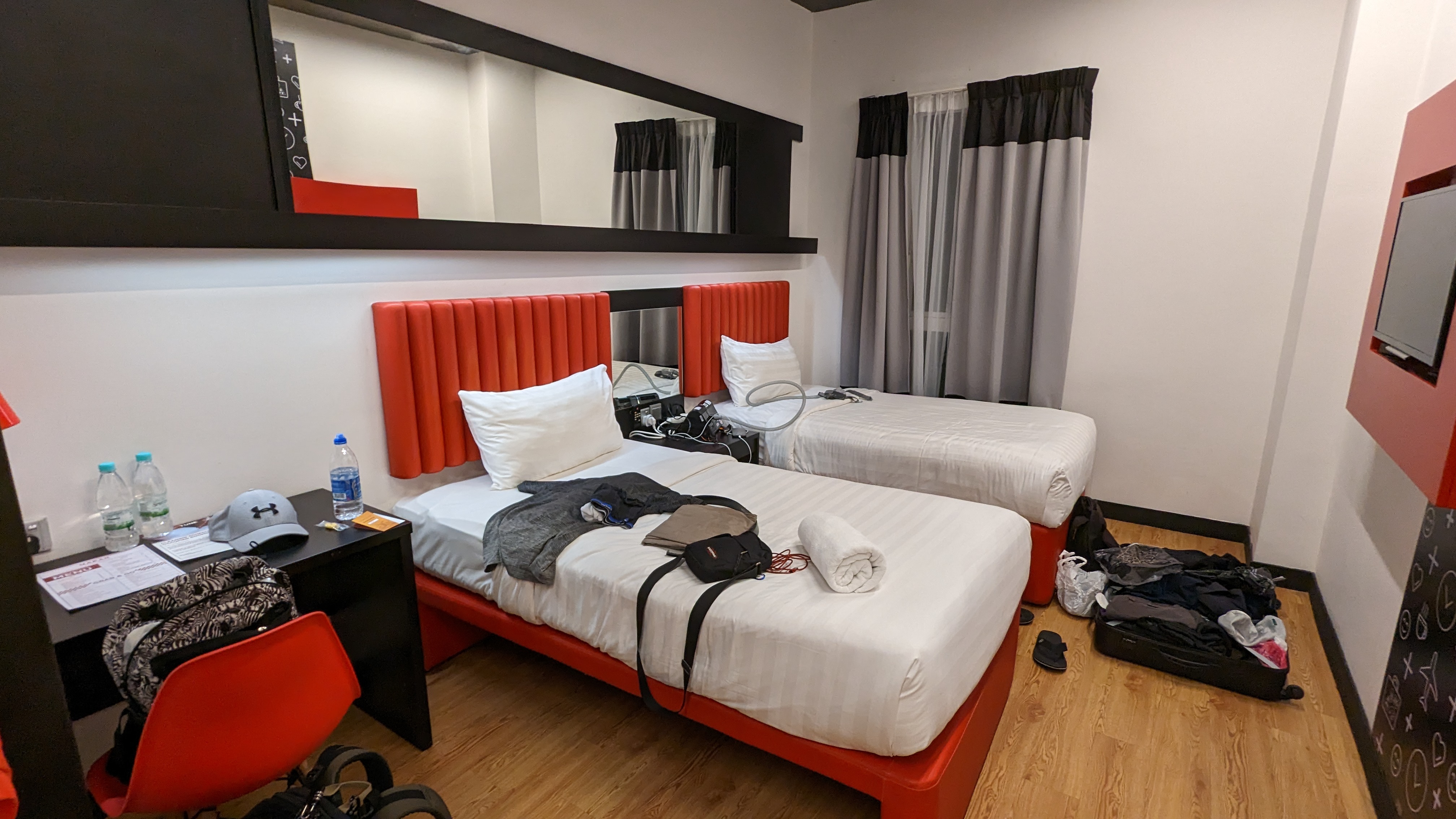 Et nous revoilà à Kuala Lumpur. Mais notre prochain vol est demain matin, donc nous n’avons pas le temps de retourner en ville. Alors nous dormirons à l’hôtel Tune à côté de l’aéroport. Et pour 75€ la nuit je le trouve plutôt bien. Par contre, il n’est pas dans le même terminal. Il nous faut donc changer. Mais ils n’ont pas de train pour relier les deux. En tout cas pas encore, je crois que c’est en construction. C’est la moindre des choses. En attendant, il faut prendre un bus. Premier problème, rien n’est clair. Il y a plein d’arrêts de bus et aucune explication. Mais bon, nous finissons par trouver sur un internet qu’il faut prendre une navette jaune. Il y a une pancarte sur un arrêt avec la photo de la navette jaune et en regardant bien, il y a bien le terminal 2 dans la liste des arrêts. Parfait, on se pose là. Mais à l’heure indiquée, nous ne voyons toujours pas de bus arriver. Quelques minutes plus tard, un bus arrive. C’est marqué terminal 2 dessus. Mais il est rouge pas jaune ! Et surtout, il ne s’arrête pas du tout devant nous et trace jusqu’au fin fond du terminal. Bon… Ce n’est pas la navette que nous attendions. Mais quand même, c’était bien marqué terminal 2 dessus. Alors nous prenons la décisions de courir pour le rattraper en espérant qu’une navette jaune n’arrive pas une fois qu’on sera à l’autre bout. Heureusement, le chauffeur prend une pause. Pas la peine de courir tant que ça. Nous lui demandons quand même. Et il nous confirme bien qu’il se rend là où nous souhaitons. Nous n’aurons pas le fin mot de la légende de la navette jaune. La pause commence à être sacrément longue. Heureusement que nous ne sommes pas pressés. Mais nous partons enfin. Les deux terminaux sont sur la même ligne droite. Mais en plus de ne pas avoir fait de train, ils n’ont pas non plus eu l’idée de faire une route. Donc le bus quitte l’aéroport et prend l’autoroute. Une fois à la bretelle pour faire demi-tour, elle est en travaux. Nous continuons notre voyage jusqu’à un centre commercial avant de pouvoir enfin faire demi-tour et redescendre sur l’aéroport. Bref, cela nous aura pris bien trois quart d’heure juste pour changer de terminal ! Heureusement, nous le découvrons sur le voyage vers l’hôtel et non l’inverse.