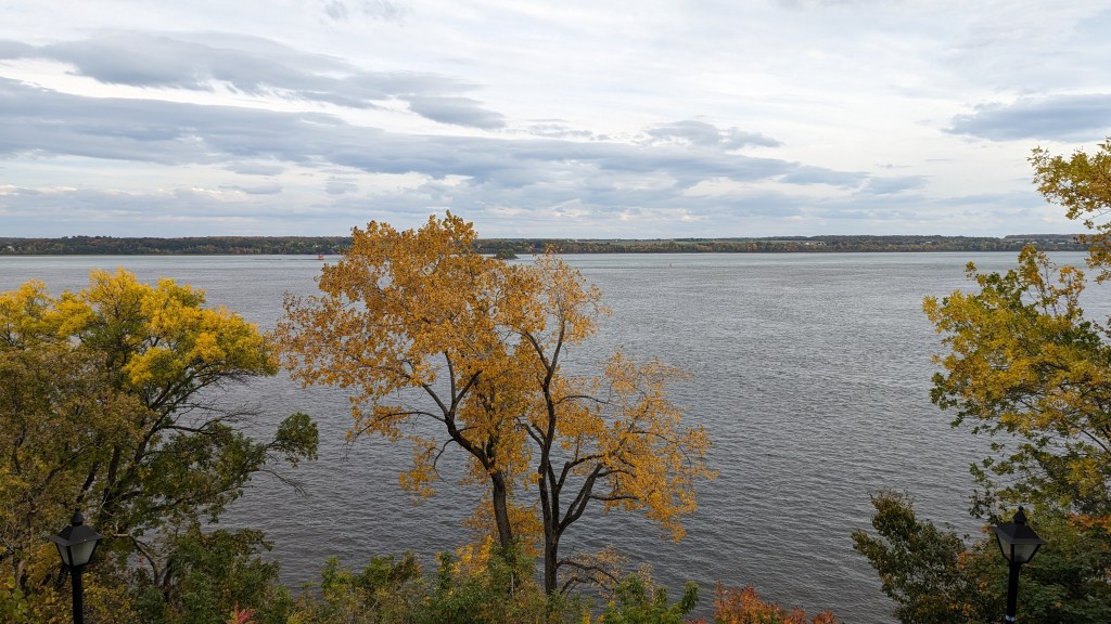 Nous poursuivons en évitant l’autoroute pour profiter du bord du fleuve, des couleurs d’automne et des belles petites maisons. Qui dit automne dit Halloween. Alors il y a plein de vendeurs de citrouilles sur le bord de la route.