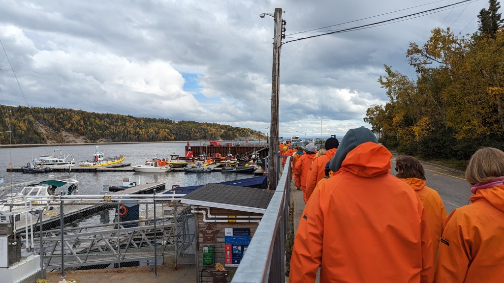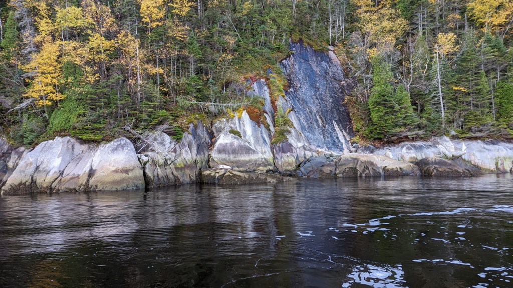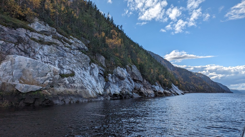 Aujourd’hui comme il y a 11 ans, nous prenons une excursion sur le Saint-Laurent pour voir les baleines. Pourquoi il y a des baleines à Tadoussac tout particulièrement ? A cause du fond marin particulier à la sortie du fjord de Saguenay. Il y a comme une cuvette. Ce qui va favoriser une abondance de poissons qui se heurt à ce barrage naturel. Les cétacés viennent profiter de ce buffet pour manger plus d’une tonne de poissons par jour durant l’été. Elles migrent ensuite parfois vers les tropiques pour donner naissance.