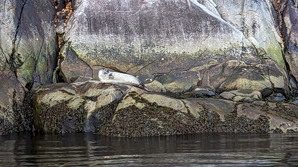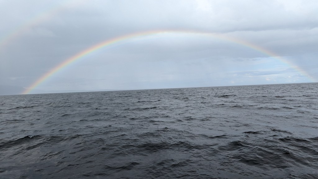 Pour l’excursion, on nous équipe d’un gros ciré orange. On a bien l’air con, mais on était bien content de l’avoir une fois en mer et surtout sous la pluie. Au final, nous avons beaucoup, beaucoup, beaucoup plus de chance que la dernière fois. Il y a 11 ans, j’avais vu un phoque et quelques rorquals. Aujourd’hui nous aurons la chance de voir de très près des baleines à bosse. Elles restent quelques minutes à la surface et sont alors visibles lorsqu’elles prennent leur respiration. Puis elles plongent dans les fonds marins en levant la queue hors de l’eau avant de s’en aider pour plonger. Et c’est ce spectacle qui est particulièrement impressionnant. Je n’ai presque pas pris de photos. Que des films pour être sûr de ne pas rater l’instant. Je ferais donc une vidéo Youtube à mon retour. En attendant j’ai posté un extrait sur Instagram.