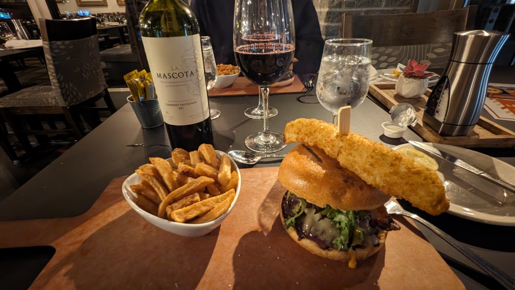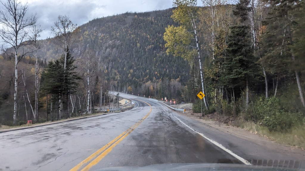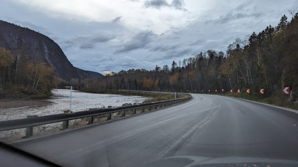 Nous nous rendons maintenant à Saguenay. La ville qui a donné son nom au fjord. Ou l’inverse, je n’en sais rien en fait. Elle se trouve à 130 km. Pour s’y rendre, nous empruntons une magnifique route, malheureusement sous la pluie avant d’être dans l’obscurité de la nuit. Nous sommes maintenant à l’hôtel Le Montagnais. Nous avons très faim, vu que nous n’avons que le croissant de ce matin dans le ventre. Alors nous n’allons pas bien loin et profitons du restaurant de l’hôtel. J’ai pris un excellent burger au cerf.