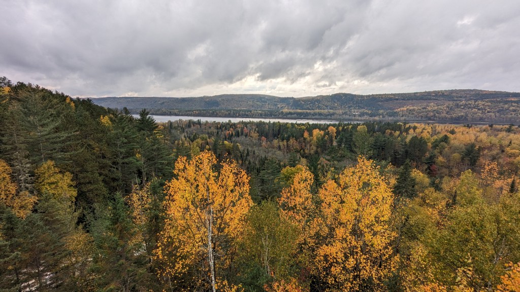 Direction maintenant le sud. J’ai repéré une autre chute à visiter en chemin. Ce n’est pas très original mais il faut bien reconnaître qu’il n’y a que ça à voir ici. Elle se situe à La Tuque sur la rivière Bostonnais. Ici la visite est gratuite. C’est si rare que nous avons peur que ce soit nul. Mais finalement c’est très sympa. D’autant qu’ils ont construit une tour d’observation qui permet de voir le magnifique paysage automnal.