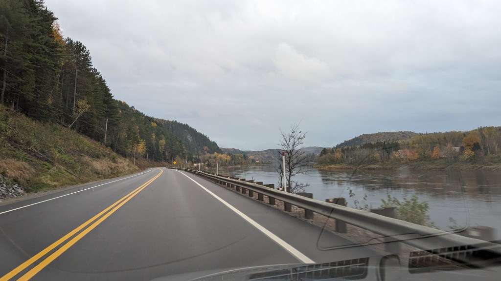 Nous poursuivons maintenant notre route qui suit la rivière Saint-Maurice. Celle-là même qui donne son nom à Trois-Rivières en se séparant en trois pour se jeter dans le Saint-Laurent. Il pleut beaucoup aujourd’hui mais la route en reste pas moins magnifique.