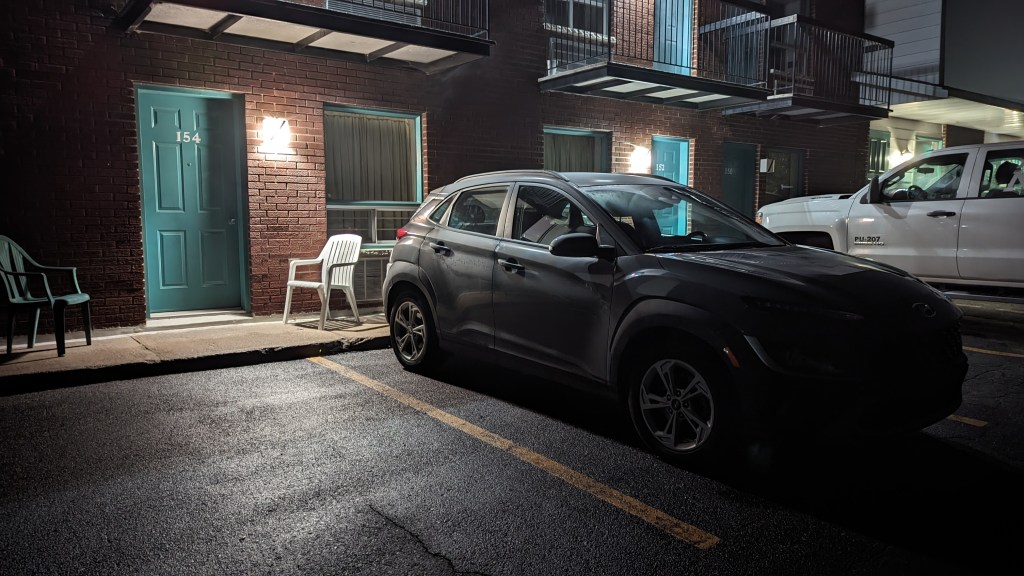 Nous voilà maintenant arrivés à notre Motel « Auberge La Rocaille ». Titine dort juste devant notre porche. Nous sommes à la porte du Parc de la Mauricie.