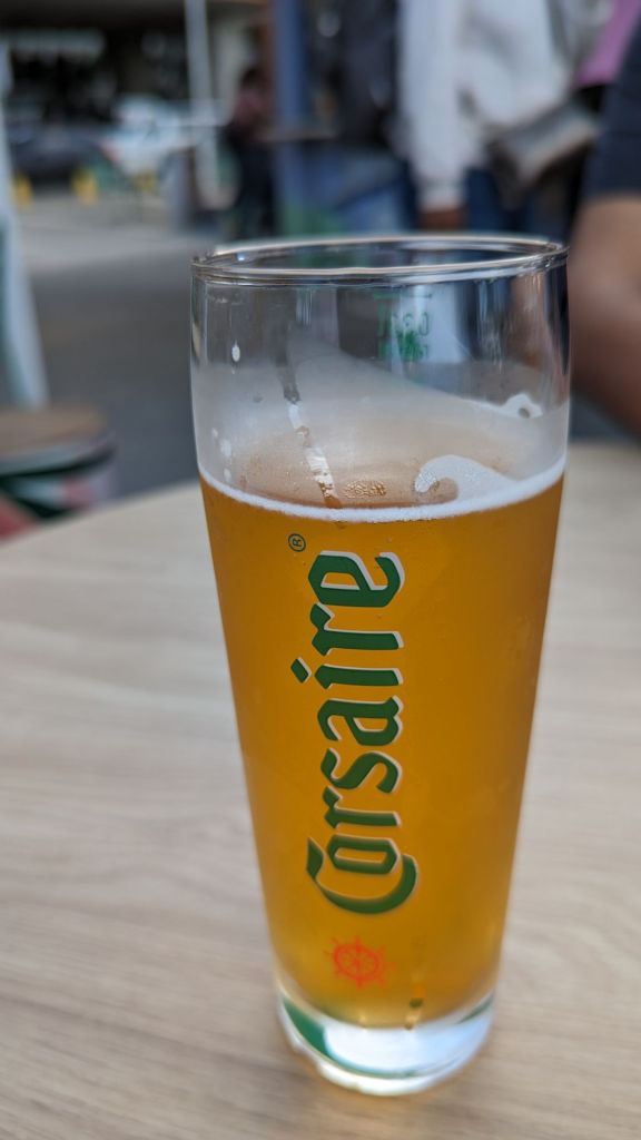 Une fois sur place, gros changement de climat. Nous avons bien trouvé la chaleur. Et aussi le rythme de vie. On devait nous apporter une voiture, mais la personne n’était visiblement pas prête du tout. Heureusement ils ont eu la bonne idée de mettre un bar sur le parking de l’aéroport. Nous prenons donc le temps de goûter la première spécialité, la bière Corsaire.