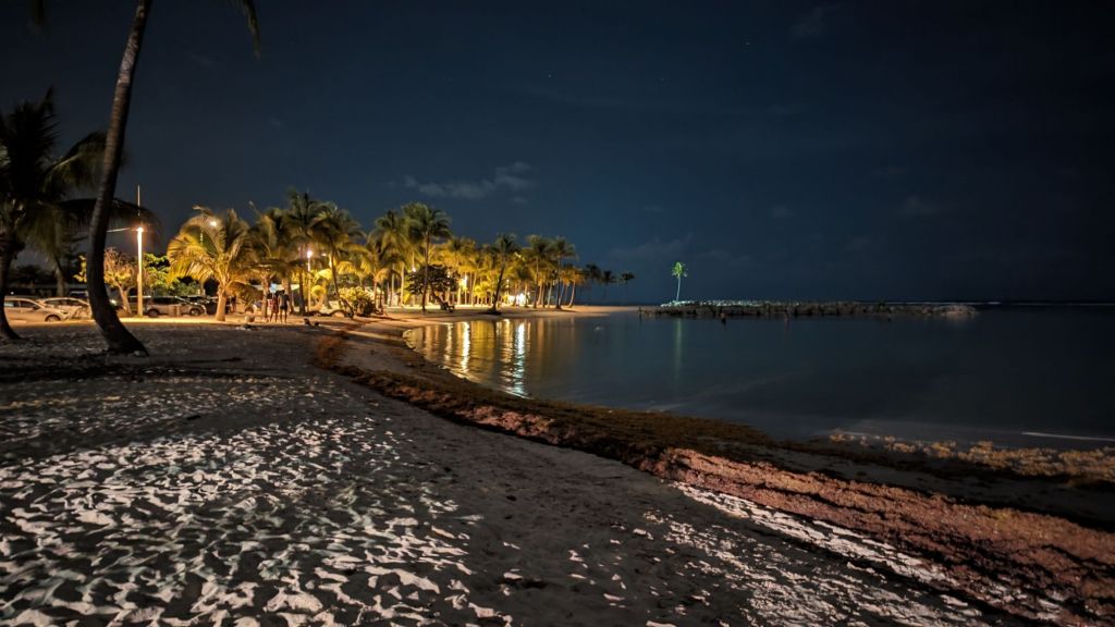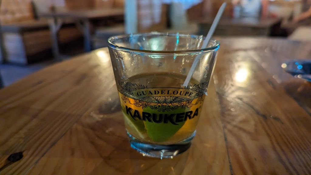 Après tout ça, la nuit est déjà tombée. Nous nous rendons en bord de plage pour y trouver un restaurant. Celui que nous avons repéré est blindé. Mais nous avons la possibilité de réserver pour dans une heure. Ce qui nous laisse le temps de continuer avec les spécialités en prenant un Ti Punch au bar de la plage.