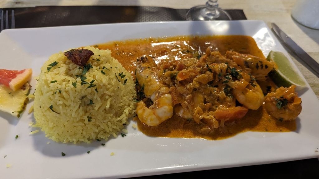 Allez, c’est maintenant l’heure du restaurant. Je vais pouvoir réellement commencer à goûter aux vraies spécialités culinaires de l’île. J’ai pris des Ouassous flambée, au rhum évidemment. Les Ouassous ce sont de grosses crevettes d’eau douce de Guadeloupe.