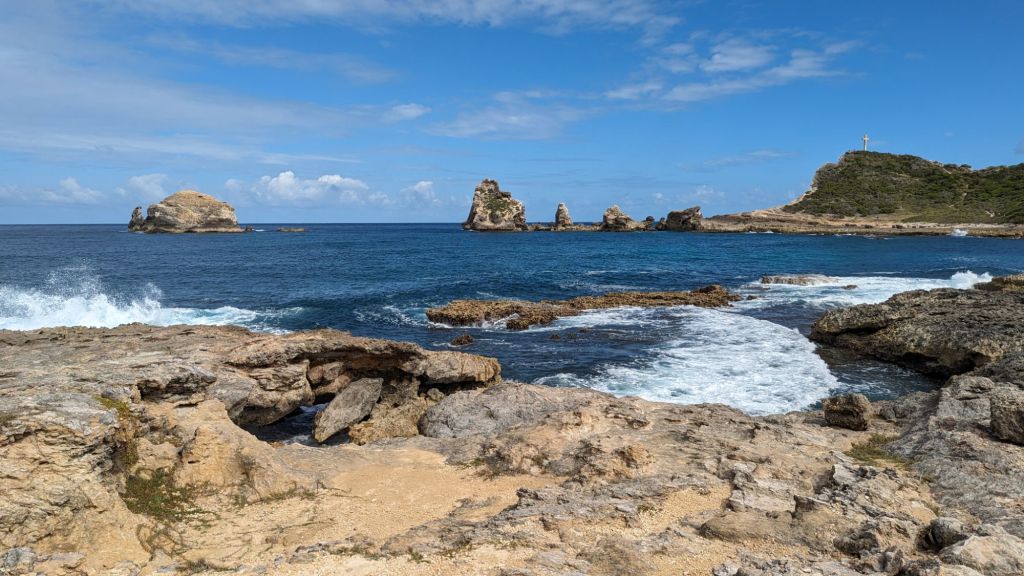 Premier réveil sur l’île. On nous l’a encore dit hier, nous sommes à la bonne saison. Nous ne devrions pas avoir de pluie. Ben il pleut déjà. La météo semble très aléatoire ici. Mais cela devrait se terminer avant midi. Alors nous prenons notre temps. De toute façon nous n’avions pas prévu de faire grand chose. Pour ce premier jour, notre seul objectif est de faire des courses au Carrefour. Pour commencer en douceur, nous voulions faire de la plage. Dès 11h le temps est beaucoup plus clément. Le supermarché se trouvant à Saint-François, à l’est d’ici. Nous décidons de chercher une plage vers la pointe des châteaux. Il s’agit de l’extrémité de l’île. Il n’y a pas de château, ce sont des formations rocheuses qui y font penser.