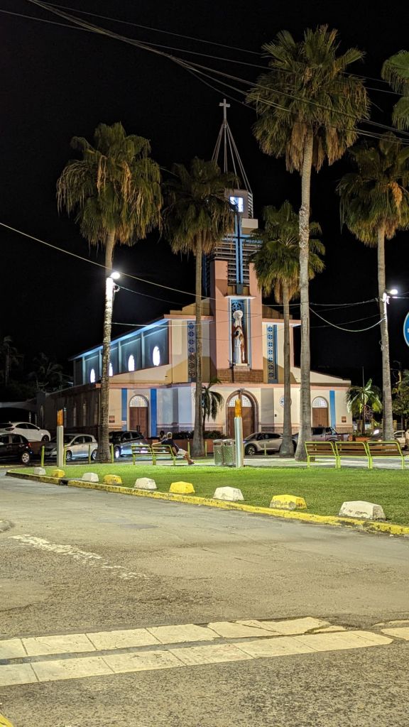 Nous avons bien mangé ce midi. Alors pour ce soir, après les courses, nous avons choisi un petit snack sur la place de Saint-Anne devant l’église. L’occasion de goûter une autre spécialité, l’Agoulou. Il s’agit d’un sandwich dans un pain original et épais. Il peut y avoir n’importe quoi dedans. C’est le pain qui porte le nom. Le mien a de la viande hachée, des sortes de Knacki, de la salade, des tomates, un œuf au plat, et une sauce créole au piment. C’est encore une belle découverte.