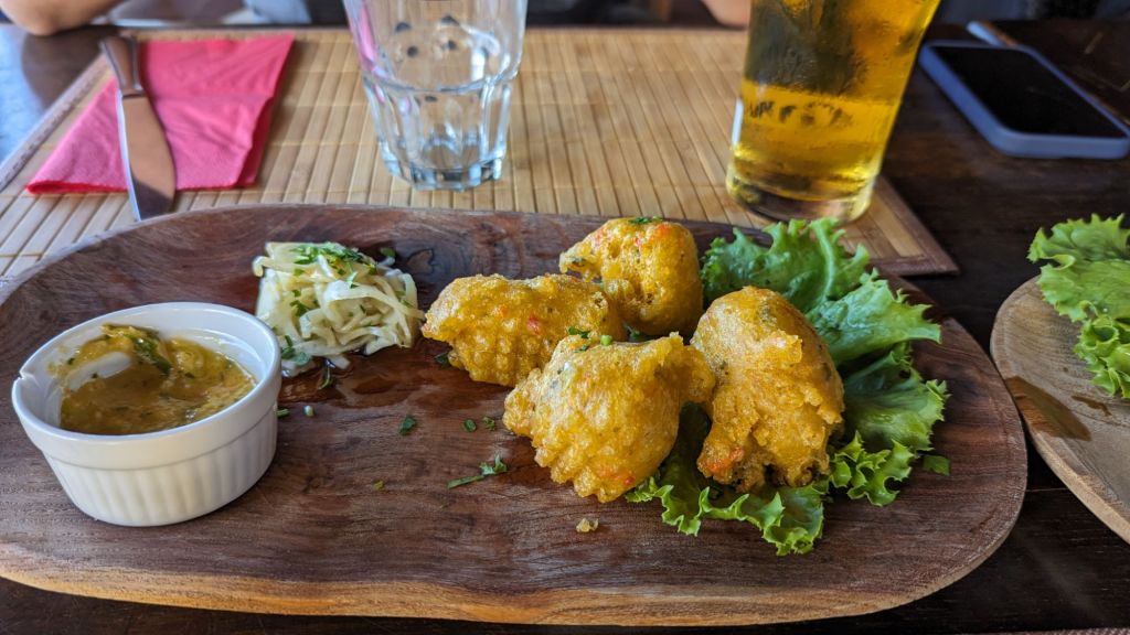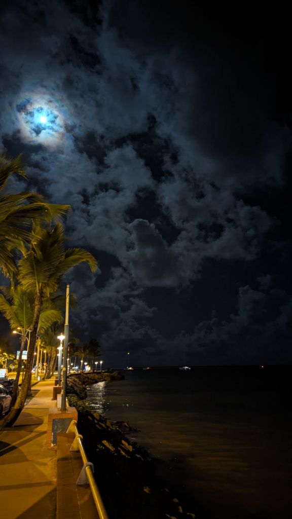 Nous n’attendons pas plus le coucher du soleil. Notre ami à un rendez-vous. Après avoir retrouvé notre voiture, nous rentrons sur Saint-Anne. Cette fois nous nous arrêtons à l’entrée de la ville en bord de mer. Cela avait l’air vivant quand nous sommes passés hier soir. Ça ne l’est pas tant que ça finalement 😄. Mais il y a plein de foodtrucks. L’occasion de goûter une autre spécialité de l’île, le Bokit. Il s’agit d’un sandwich proche lui aussi du Gyros, mais c’est un pain frit. Ils y a plusieurs foodtrucks alignés le long de la mer. Nous choisissons celui où il y a le plus de monde. Normalement c’est un gage de qualité. La contrepartie est que nous attendons une plombe ! Et alors que cela va enfin être notre tour d’être servi. Nous essuyons et grosse averse ! En moins de 2 min nous sommes gaugés. Au moins cela nous conforte dans l’idée de manger à la maison. De toute façon le coin n’est pas très sympa finalement. Oui il y a la mer. Mais il y a surtout la route et les groupes électrogènes des foodtrucks tous les 20 m. Et finalement, nous sommes un peu déçus du Bokit. Ça a surtout le goût du beignet. Et c’est un peu sec. Il manque de la tomate je trouve.