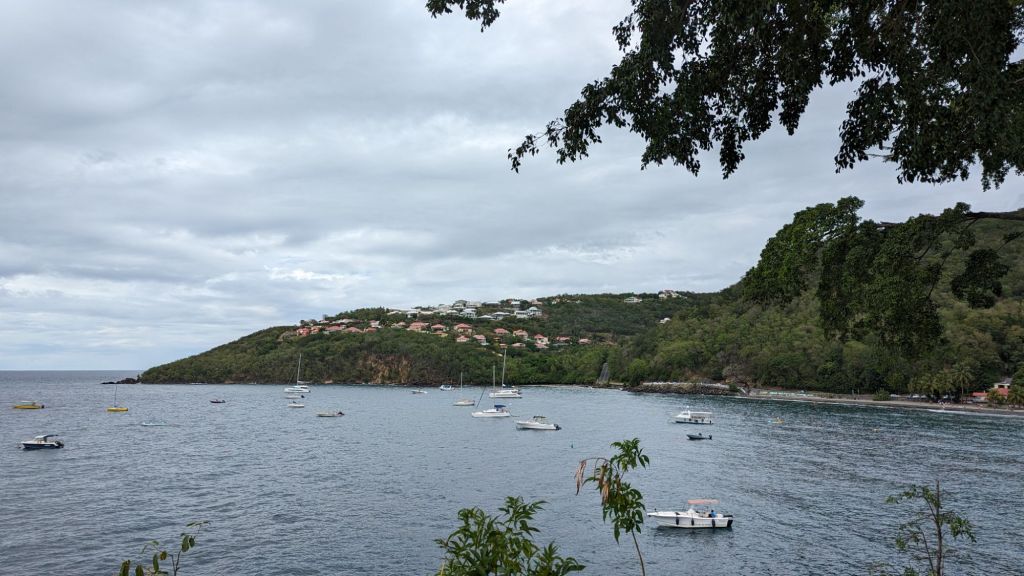 Encore une fois, la météo est très capricieuse ce matin 🙄. D’ailleurs cette nuit on s’est pris une averse colossale. La pluie faisait tellement de bruit que je me serais cru dans une caravane. Ça m’a réveillé. Nous n’avons vraiment pas de chance de ce côté là. Mais bon, nous ne nous laissons pas abattre. Nous décidons de traverser l’île de Basse-Terre en prenant la bien nommée route de la traversée. C’est une route sinueuse au cœur des montagnes. La végétation est luxuriante. On ne se croirait pas à la saison sèche. Mais ça nous l’avions déjà remarqué. Sur le chemin, nous nous arrêtons à la cascade aux écrevisses. C’est une toute petite cascade qui donne sur un petit bassin. Il y a beaucoup de monde qui se baigne. L’accès au bassin est un peu casse-gueule car les rochers sont très glissants. Mais je parviens tout de même à venir me tremper les pieds. L’eau est plutôt bonne pour une rivière. Nous décidons donc de retourner à la voiture se changer. Le parking est tout proche de la cascade. Mais sur le chemin, une nouvelle averse se déclare. Nous décidons de laisser tomber.