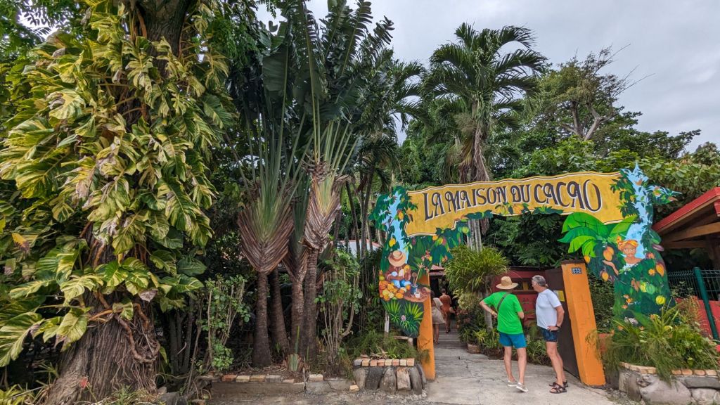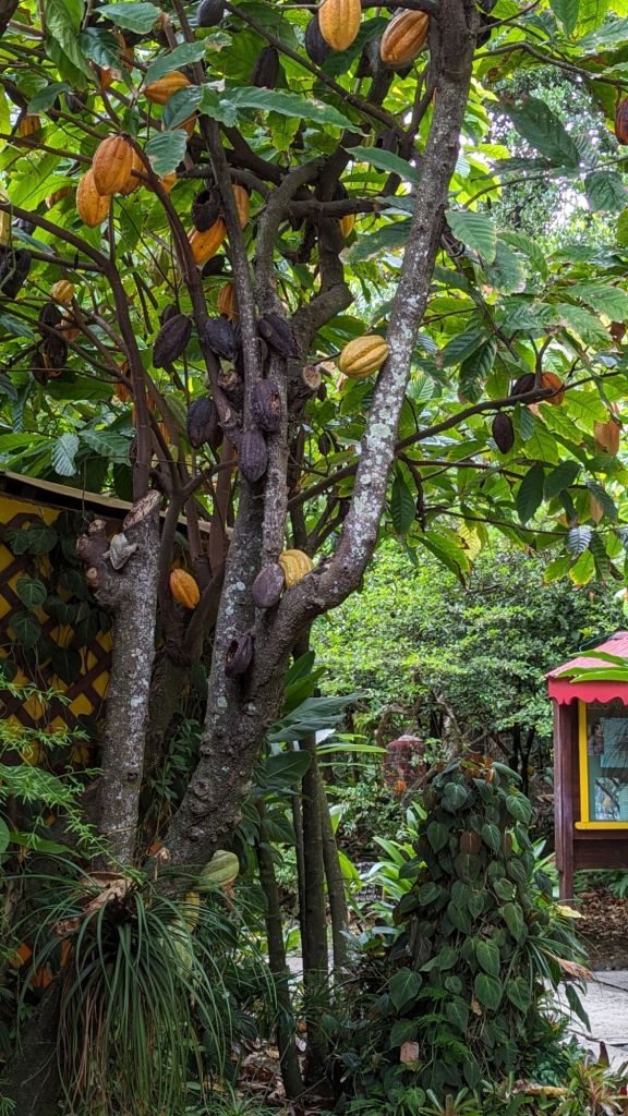 Nous remontons un petit peu au Nord pour se rendre à la Maison du Cacao. Mais je n’ai pas l’intention de faire la visite. De toute façon il est conseillé de réserver donc nous n’aurons probablement plus de place. Mais en plus la visite dure 1 h et demi dont une heure d’explication dans une sorte de salle de classe. Celà ne m’intéresse pas du tout. Je veux juste voir un cacaotier. L’accès au jardin fait partie de la visite. Mais heureusement, nous pouvons apercevoir un arbre depuis l’entrée.